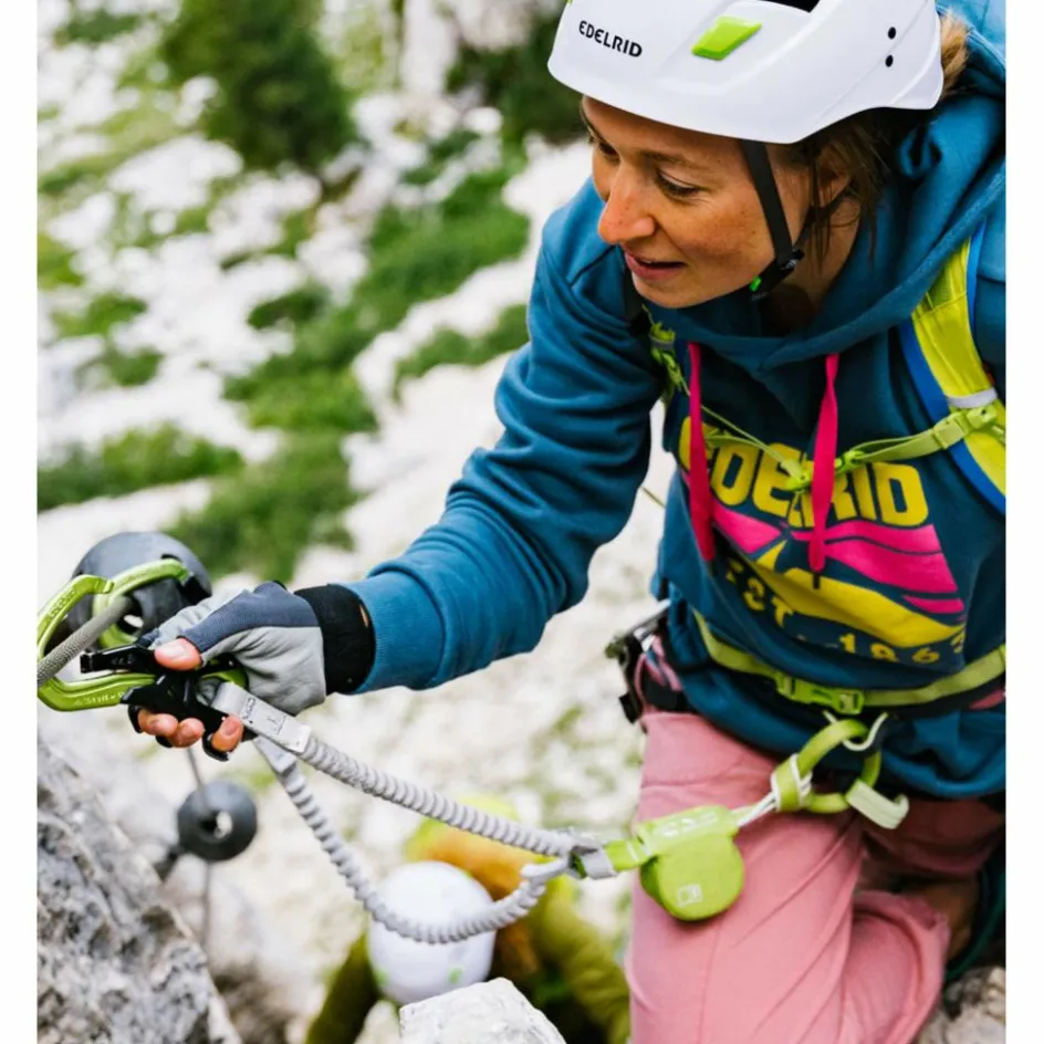 Die überarbeitete Klettersteignorm von Januar 2017 fordert niedrigere Fangstöße für alle Gewichtsklassen sowie einen verlängerten Bremsweg von 2,2 Metern für Klettersteigsets. Um dies zu erfüllen, wurden die Bandfalldämpfer in den letzten Jahren meist deutlich größer und die Klettersteigsets entsprechend schwerer. Mit der neuesten Generation seiner Via Ferrata Sets (VI) präsentiert uns Edelrid nun einen neu entwickelten Bandfalldämpfer, der deutlich kompakter und leichtgewichtiger ist und dennoch alle Anforderungen an die neue Norm erfüllt.