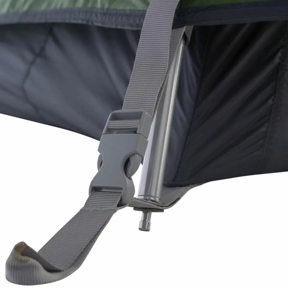 Der Aufbau gelingt dank der einfachen Konstruktion mühelos und ist von zwei Personen in wenigen Minuten erledigt. Zwei Gestängebögen bilden eine große Apsis, die ausreichend Stauraum für Ausrüstung oder Platz zum Aufstellen eines Tisches mit Stühlen bietet. Mit einer Höhe von bis zu 190 cm ermöglicht sie zudem angenehmes Stehen. Ein Seiteneingang und ein großer Fronteingang erlauben dir den Zugang zur Apsis. Zwei große Netztaschen sorgen für Ordnung und Übersicht, indem du darin leichte Ausrüstung verstauen kannst.