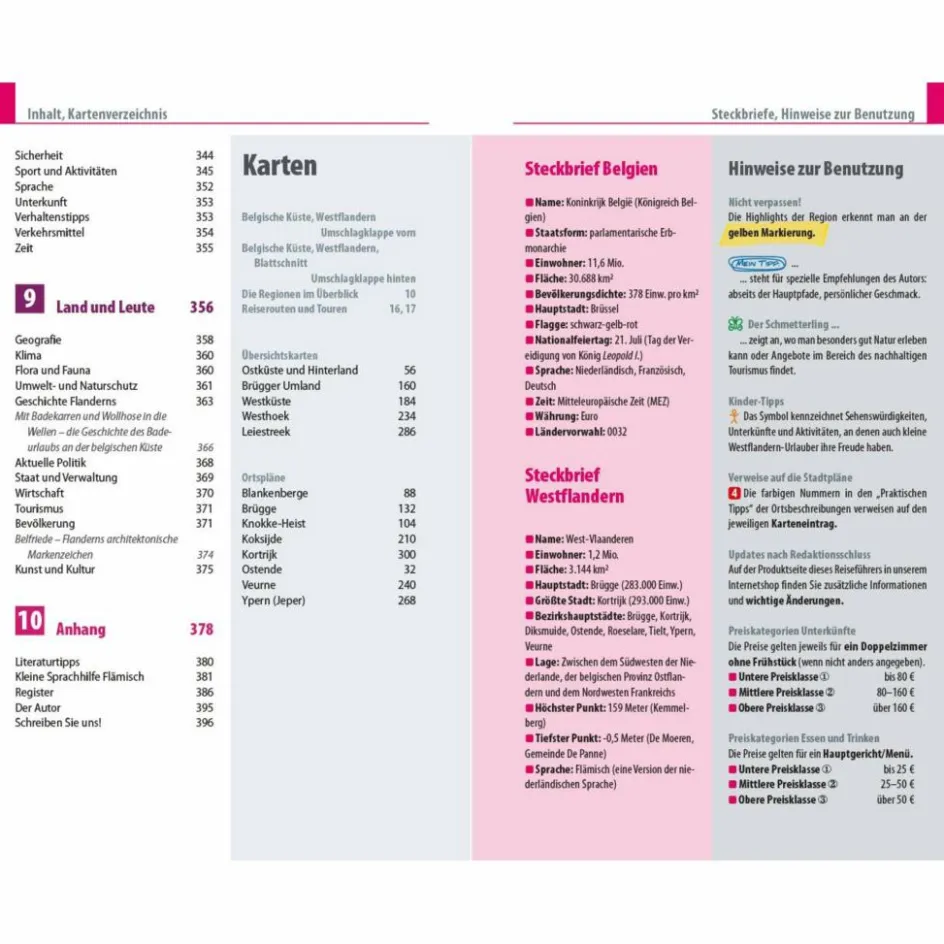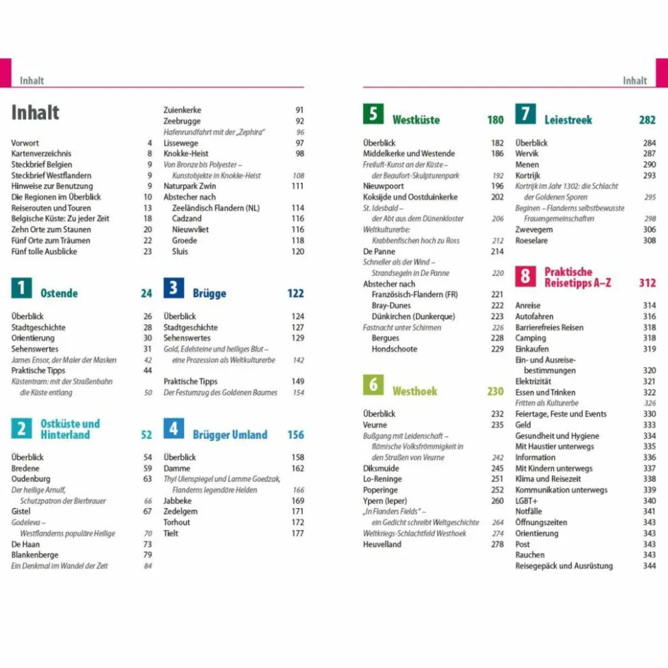 Er zeigt Orte für gemütliche Badeurlaube, fesselnde Naturerlebnisse, einmalige Wander- und Radrouten und interessante Stadterkundungen auf. Brügge und Ostende werden besonders ausführlich porträtiert. Aber auch die Menschen, ihre Lebensart und die kulinarischen Besonderheiten der Region kommen nicht zur kurz. Typische Speisen, Biere und Weine Flanderns werden vorgestellt und Einkaufsadressen für frischen Fisch und Meeresfrüchte verraten.