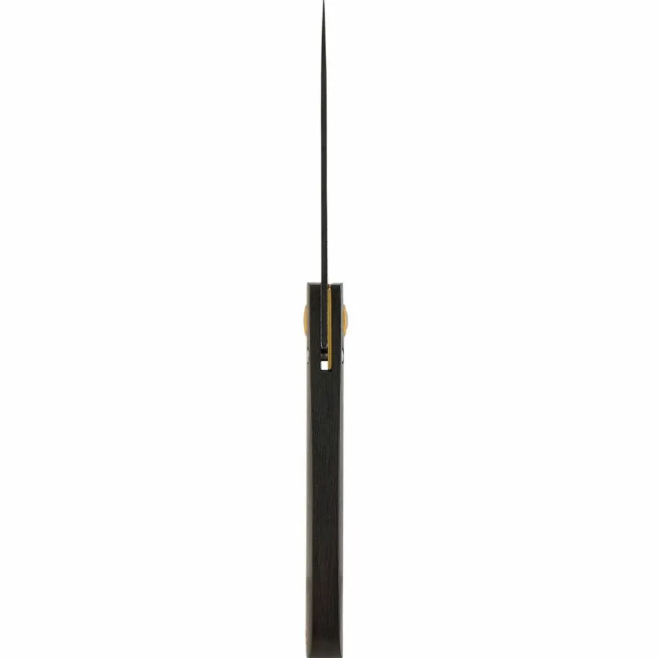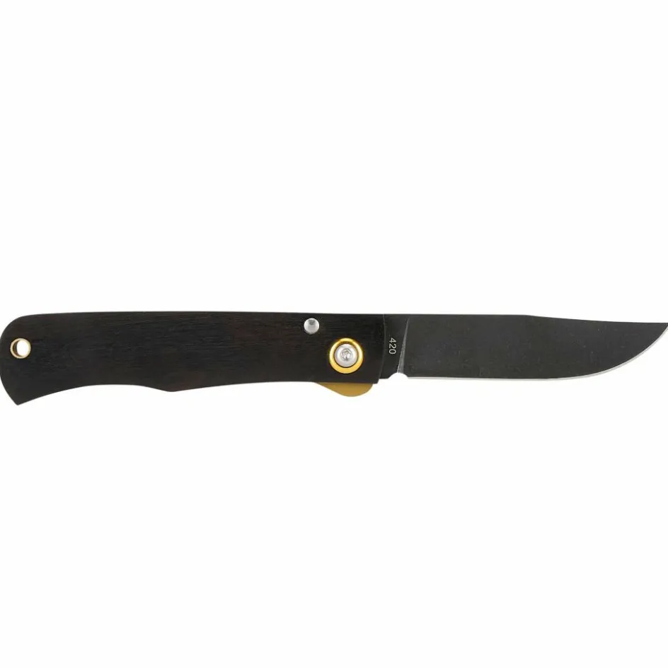 Der Griff aus hartem, stilvollem Ebenholz besitzt am Griffende eine messingfarbene Fangriemenöse zur Befestigung einer Kordel. Auch der Linerlock und die Platinen ergänzen diesen Look.