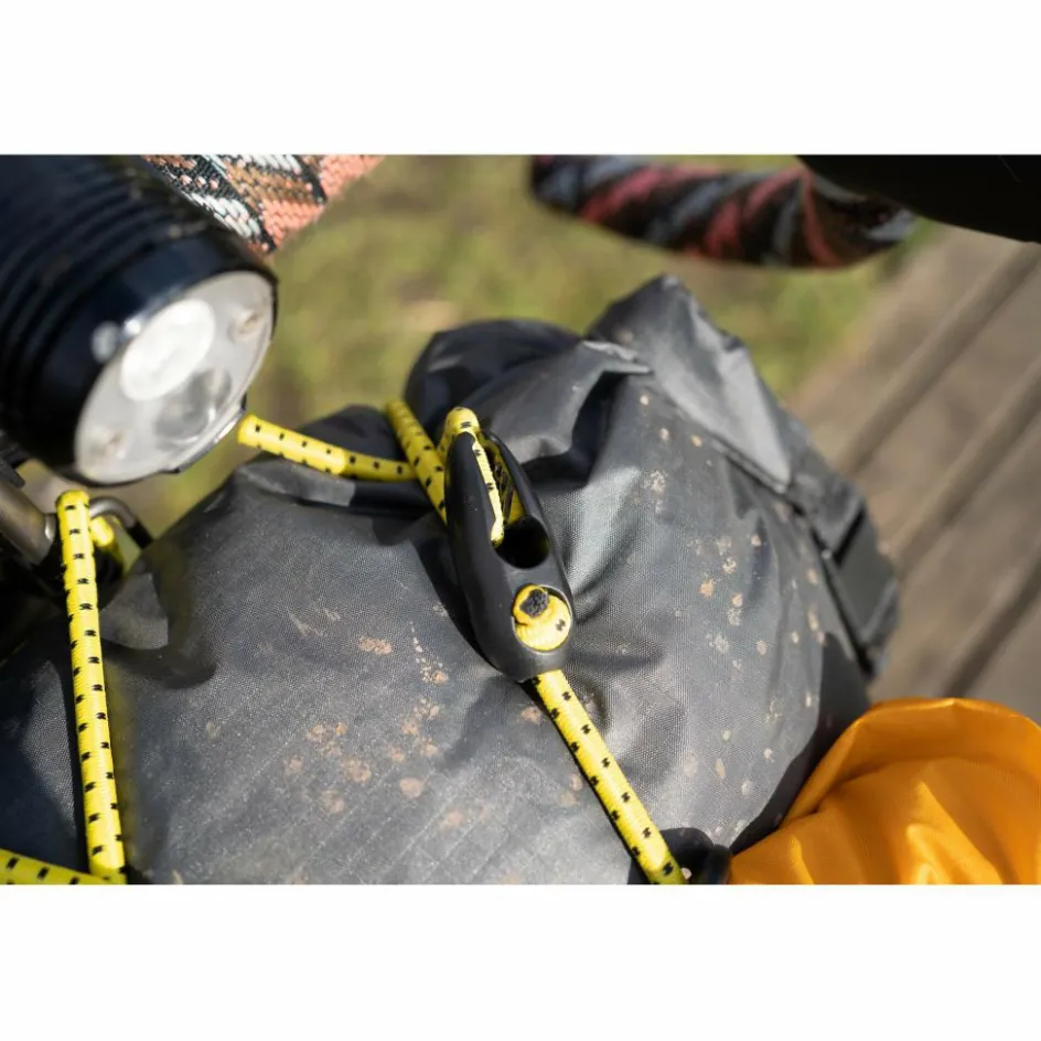 Mit den leicht eiförmigen Klemmstücken am Ende jeder Kordel stellst du die Länge des Riemens stufenlos ein und kannst dein Gepäck ganz nach Belieben straff oder eher leicht fixieren. Beim Klemmstück führst du die Kordel einfach durch die Bohrung und ziehst es dann in die Klemm-Nut. Fertig!
