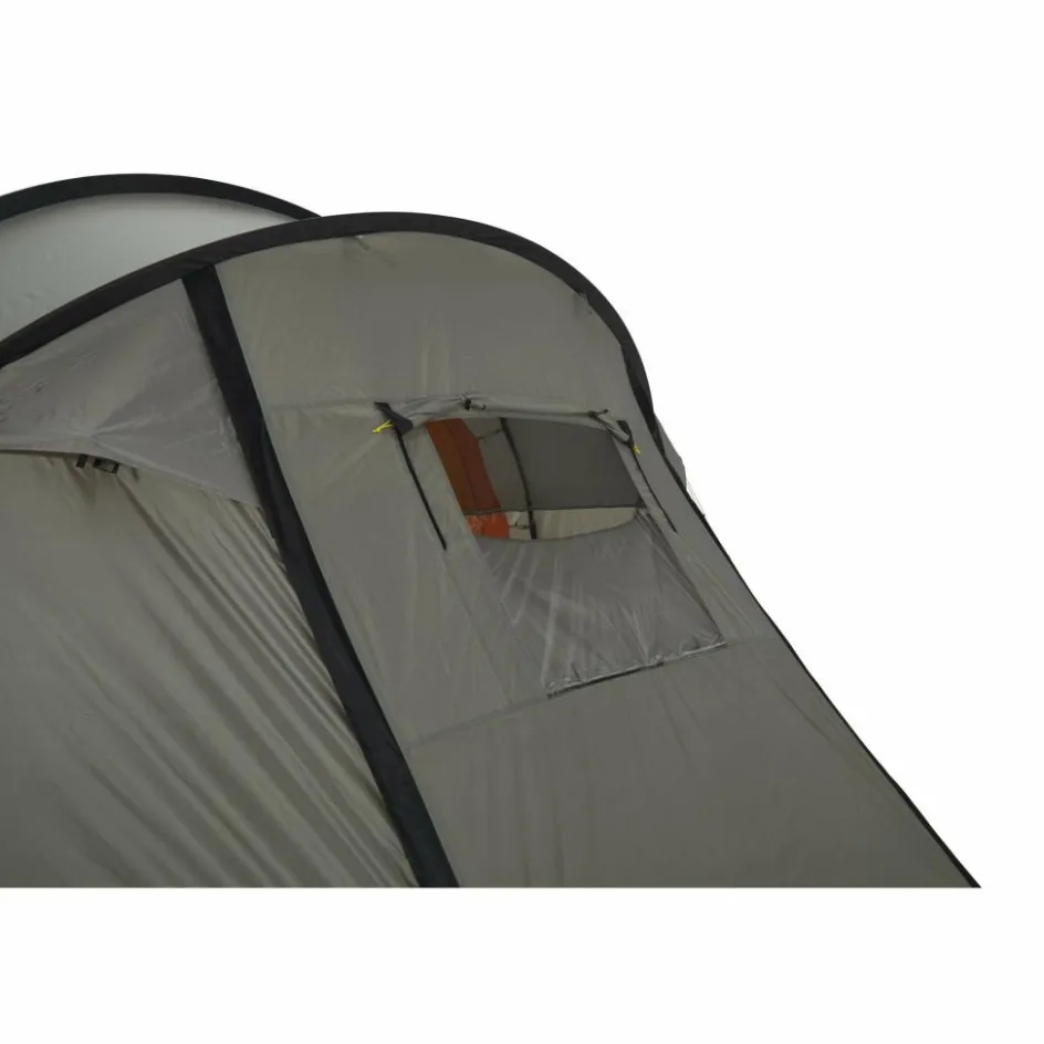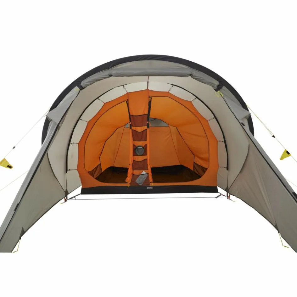 Tunnelzelt mit 180 cm Stehhöhe, das 3-4 Personen Platz bietet. Es eignet sich gut für kleine Familien und hat in der Apsis genügend Fläche für einen Tisch mit Stühlen.