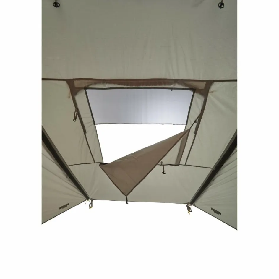 Das Innenzelt ist 235 cm breit und bietet so 3-4 Isomatten Platz. Bei Bedarf kann eine Trennwand eingezogen werden, die das Innenzelt in zwei Schlafkabinen für eine und zwei Personen aufteilt. Vier Netztaschen, je zwei an jeder Außenseite, nehmen die Taschenlampe, Ohrstöpsel und die Schlafmaske auf.