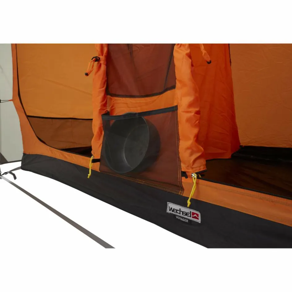 Durch die außen liegenden und farblich markierten Gestängekanäle ist ein müheloser Aufbau selbst von nur einer Person möglich. 22 Abspannpunkte fixieren das Voyager sicher am Boden, sodass auch starker Wind dem Zelt nichts anhaben kann.