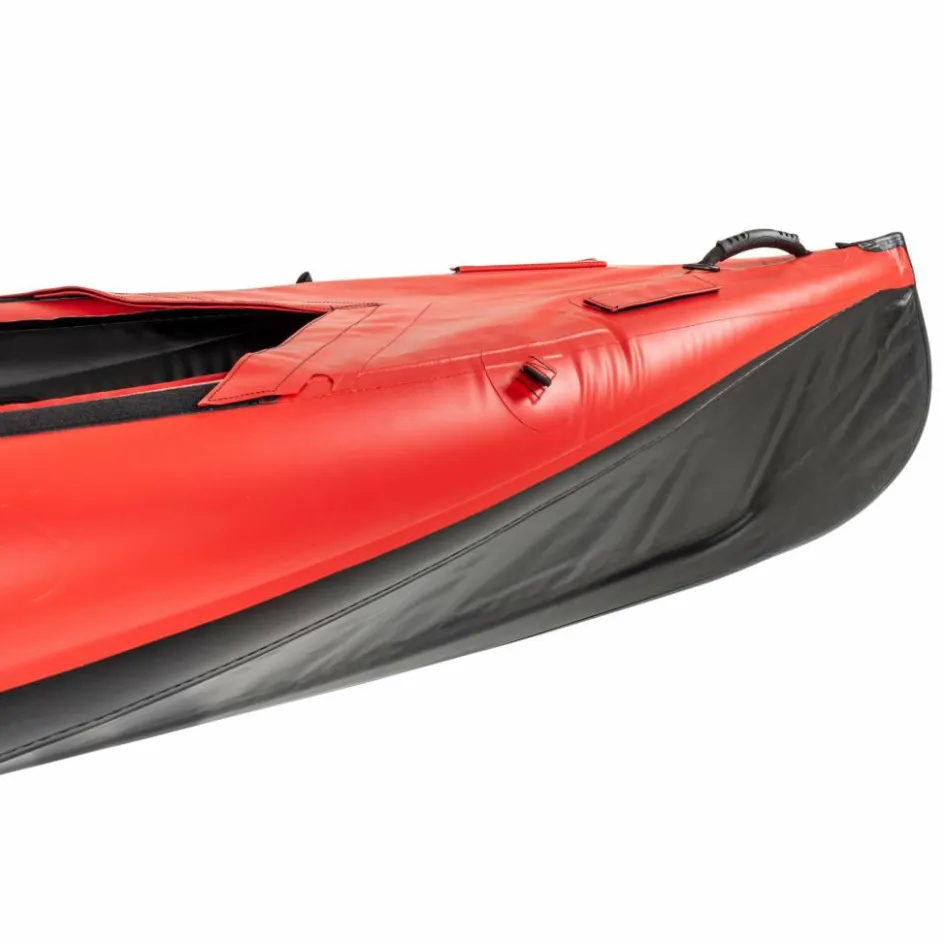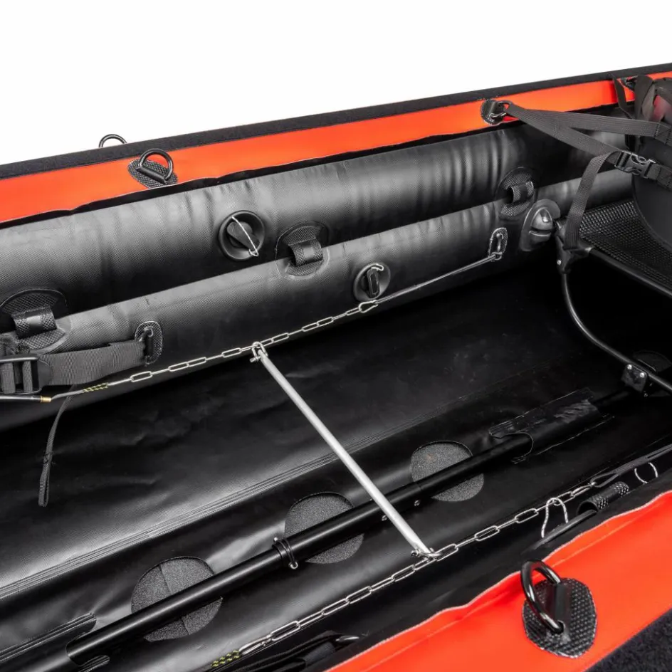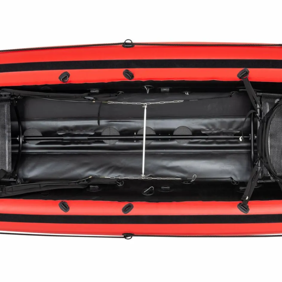 Die Kombination aus einem minimalistischen Aluminiumgestänge und seitlichen Luftelementen sorgt für die nötige Steifigkeit und Fahrstabilität des Hybriden. Die Außenhaut besteht aus reißfestem PVC, ein installierter Kielstreifen schützt zusätzlich vor Abrieb. Das kompakte Scubi ist durch seine leichte Bauweise ideal für alltägliche Touren auf ruhigen Gewässern.