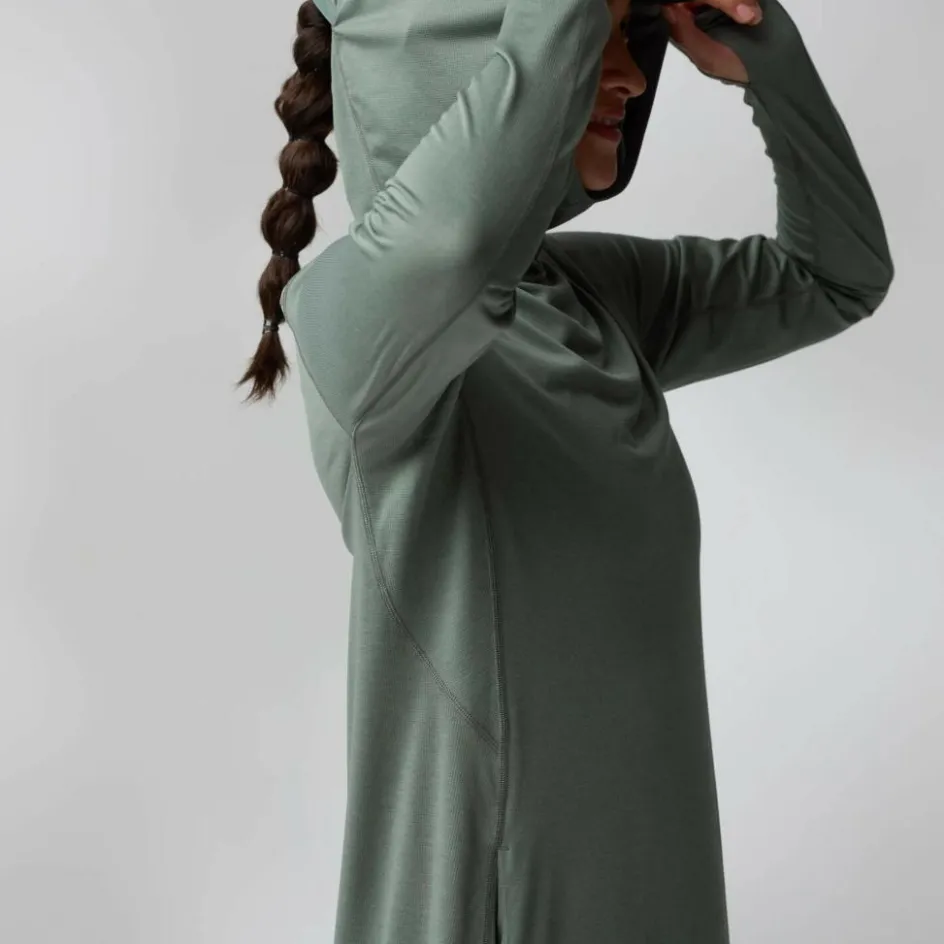 Leichtes und bequemes Kleid für Outdoor-Aktivitäten und Reisen in warmen Klimazonen. Hergestellt aus einem technischen Jersey-Strick, der Feuchtigkeit ableitet und schnell trocknet, um auch an sonnigen Tagen maximalen Komfort zu bieten. Lange Ärmel und Kapuze bieten Schutz vor der Sonne, während Daumenlöcher ein Hochrutschen der Ärmel verhindern. Der passgenaue Schnitt ist locker genug, um die Luft zirkulieren zu lassen. Zwickel unter dem Arm bieten zusätzliche Bewegungsfreiheit.