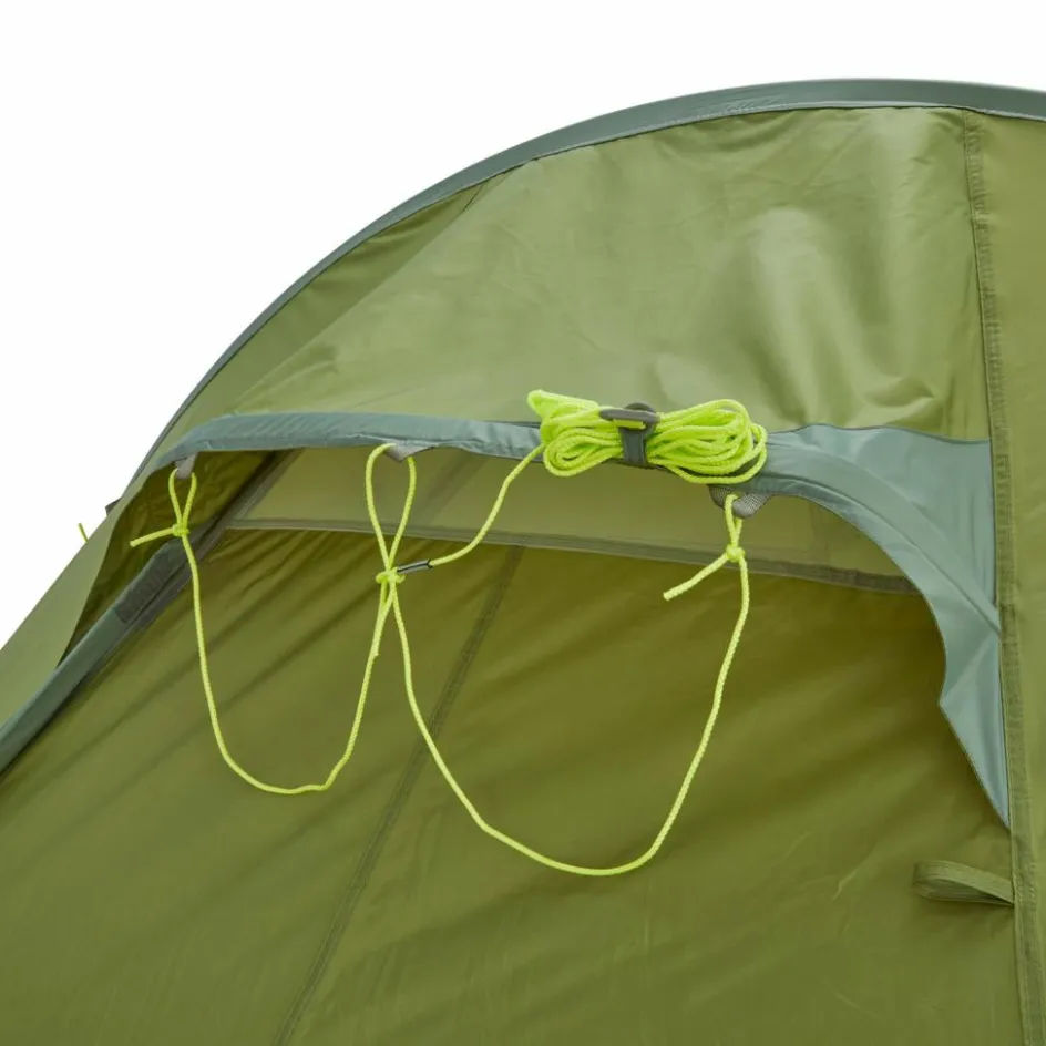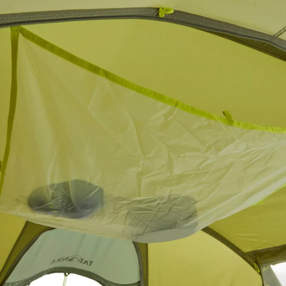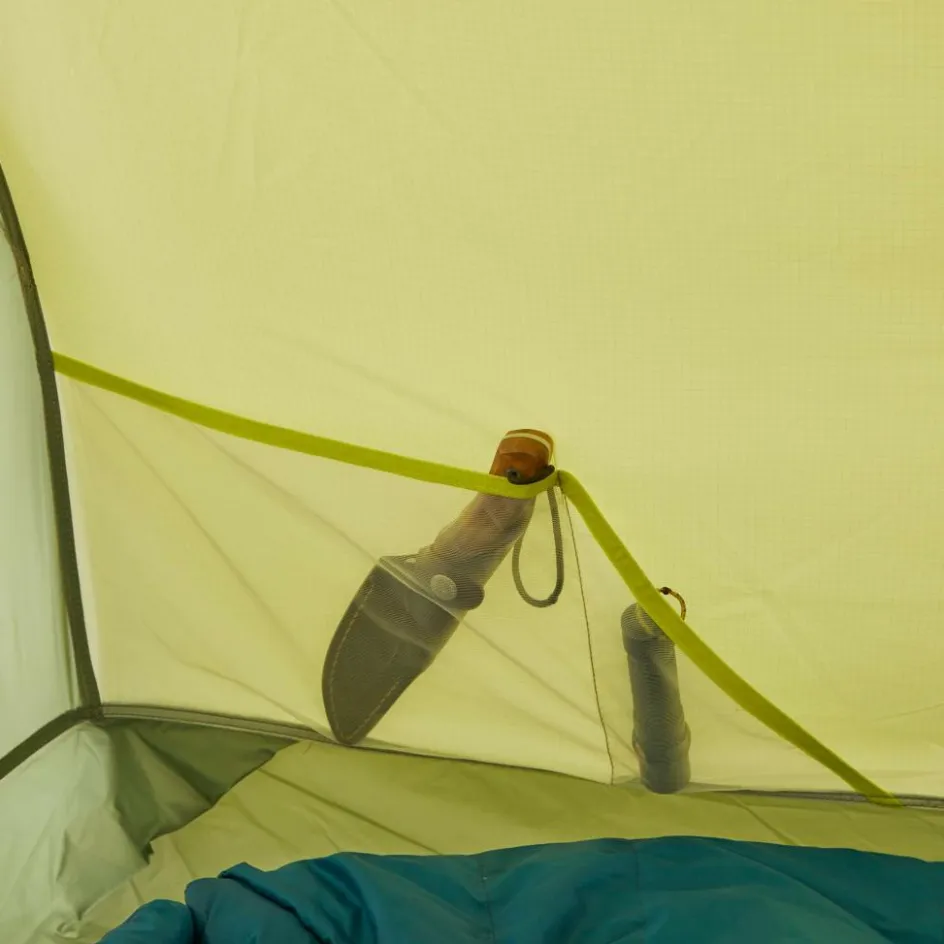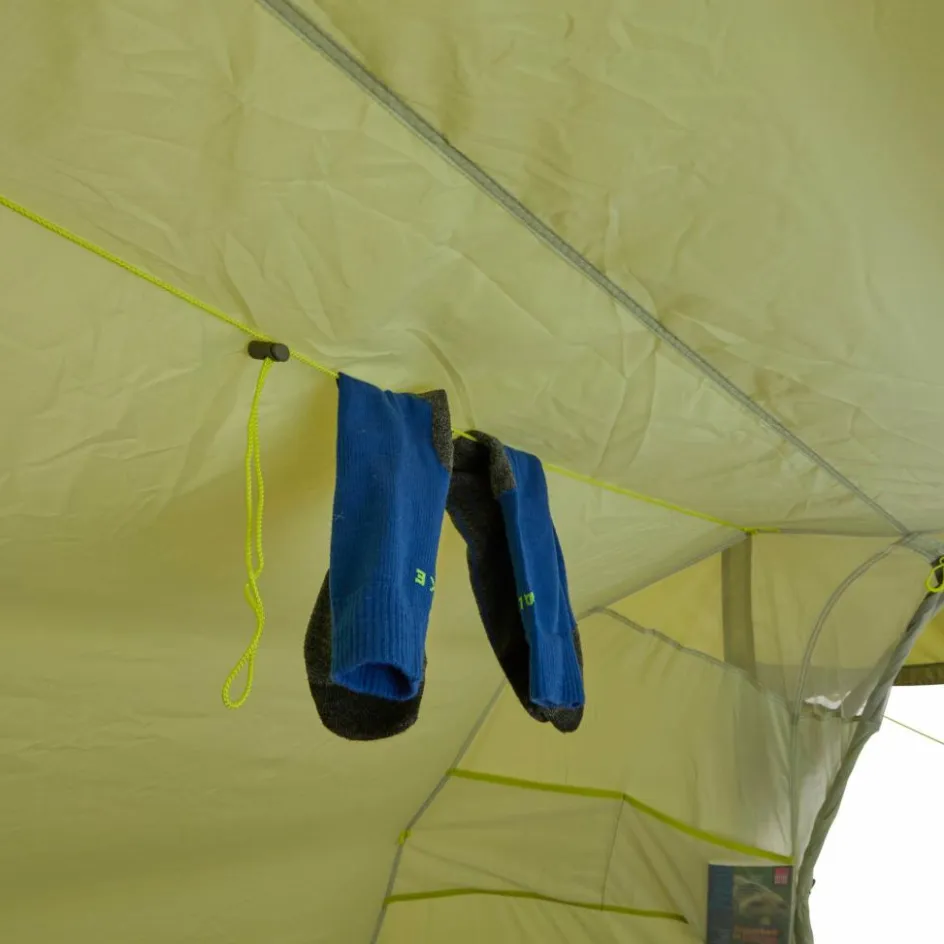 Die vielen Seitentaschen verstauen dabei Bücher, Taschenlampe, Smartphone und andere Kleinteile. Auf der integrierten Wäscheleine kannst du feuchte Kleidung über Nacht trocknen. Weitere Schlaufen erlauben dir auch mehrere Leinen im Innenzelt zu spannen oder eine elektrische Zeltlaterne aufzuhängen.