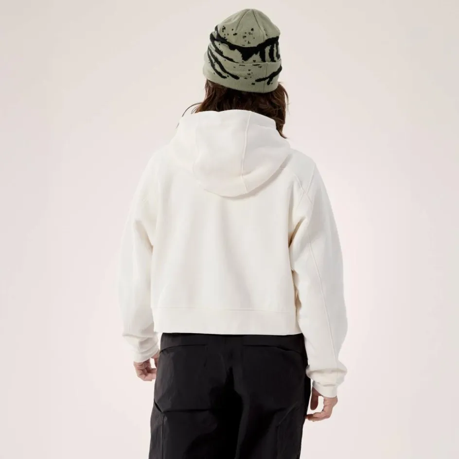 Die kurz geschnittene Kapuzenjacke besteht aus einem Mix aus Baumwolle und Polyester. Durch den hohen Anteil an Baumwolle ist der Hoody pflegeleicht und strapazierfähig. Der Polyester-Anteil lässt ihn nach schweißtreibenden Aktivitäten schneller wieder trocknen (im Vergleich zu einem Hoody aus reiner Baumwolle). Die weiche Innenseite liegt besonders angenehm auf der Haut. Mit seinem cleanen Design mit Arc’teryx Logo im Brustbereich und seinem lockeren Schnitt ist die Jacke perfekt für den aktiven Alltag und entspannte Abende auf dem Sofa.