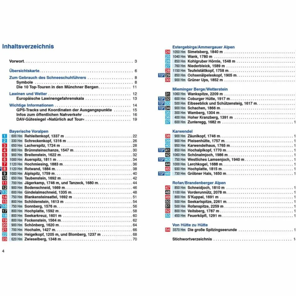 54 Schneeschuhtouren, 56 Höhenprofilen, 54 Tourenkärtchen im Maßstab 1:50.000 und 1:75.000, zwei Übersichtskarten im Maßstab 1:600.000 und 1:1.000.000