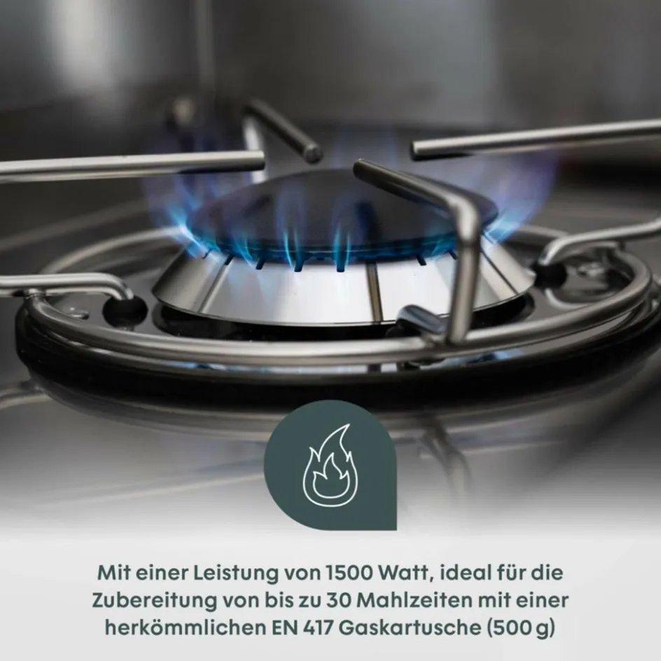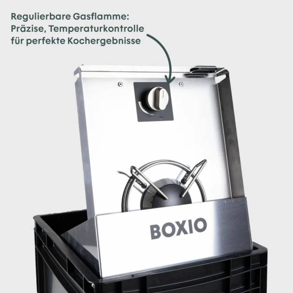Die leistungsstarke Gasflamme bietet dir eine zuverlässige Hitzequelle und lässt sich stufenlos regulieren. Mit einer handelsüblichen EN 417 Gaskartusche (500 g) kannst du bis zu 30 Mahlzeiten zubereiten. Das stabile Edelstahl-Gehäuse schützt die Technik und sorgt für eine hohe Langlebigkeit. Die integrierte Zündsicherung erhöht die Sicherheit beim Betrieb. Dank des kippsicheren Designs kannst du auch auf unebenem Untergrund entspannt kochen. Nach dem Einsatz verstaust du deine Kochutensilien direkt im Gerät, das sich zudem problemlos mit anderen Boxio Produkten stapeln lässt – ideal für eine aufgeräumte Ausrüstung.