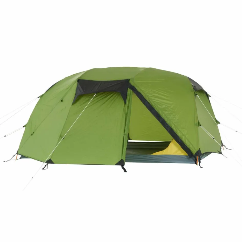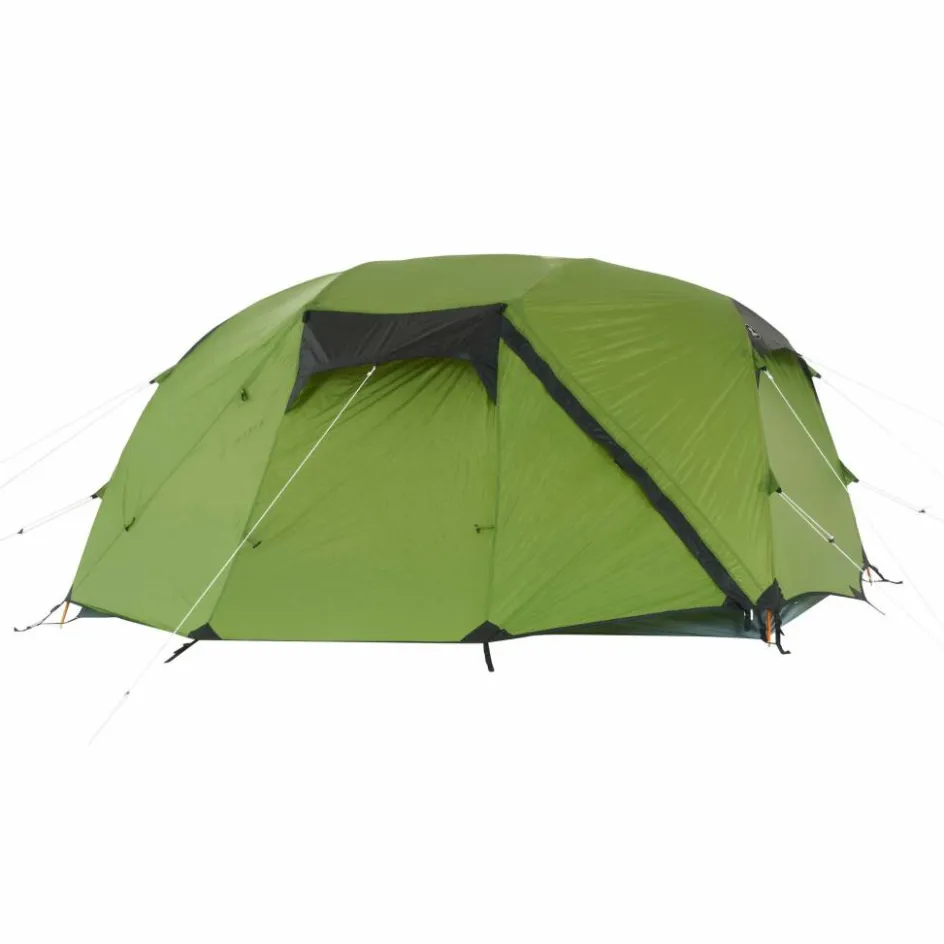 Großzügig bemessenes Kuppelzelt, das durch seine weite Aufspannung reichlich Platz im Innenbereich bietet. So lässt sich auch ein Tag bei Regen gut abwettern, ohne einen Lagerkoller zu bekommen.