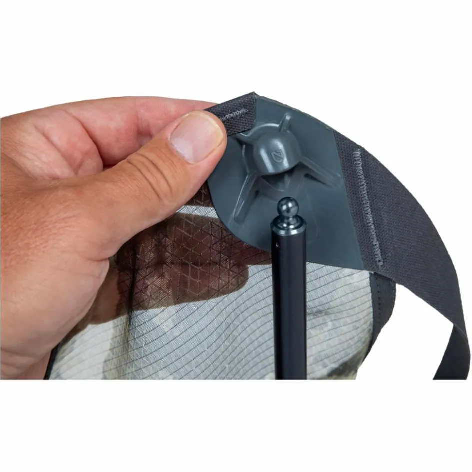 Das Gestänge wird wie bei einem Zeltgestänge mit einem Gummizug zusammengehalten, so dass der Aufbau denkbar einfach ist. Unten und am oberen Ende des Gestänges sitzen Kugelstücke, die ihr Gegenstück am Sitzbezug haben. Einfach Kugel und Kugelpfanne zusammenklicken, schon ist der Moonlite Elite einsatzbereit. Dank der Kugeln ist der Bezug beweglich aufgehängt und kann sich so deinem Körper anpassen. Das erhöht zusammen mit dem vorgeformten, nahfreien Bezug den Sitzkomfort zusätzlich.
