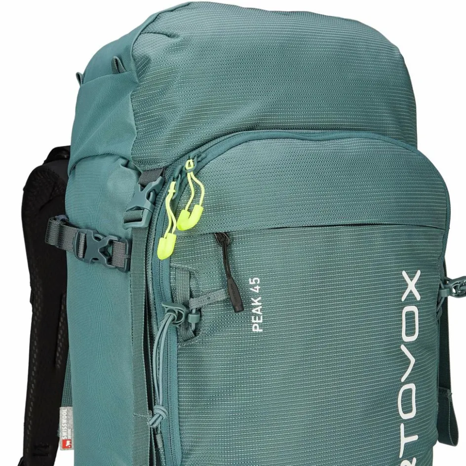 Ortovox hat dem Peak 45 ein neues Tragesystem verpasst, das Swisswool 3D Back System. Dafür wurden Wollvlies, ergonomische Schaumeinsätze und ein 3D-geprägtes Obermaterial clever kombiniert. Das Ergebnis ist ein Kontaktrücken, bei dem du trotz des festen, körpernahen Sitzes ein trockenes Tragegefühl hast. Denn an allen Kontaktpunkten befinden sich Wollpads und Wolle hat den Vorteil, dass sie bis zu 30 Prozent ihres Eigengewichts an Feuchtigkeit aufnehmen kann. Die Wollpads kommen übrigens auch an Schulter- und Hüftgurten zum Einsatz.