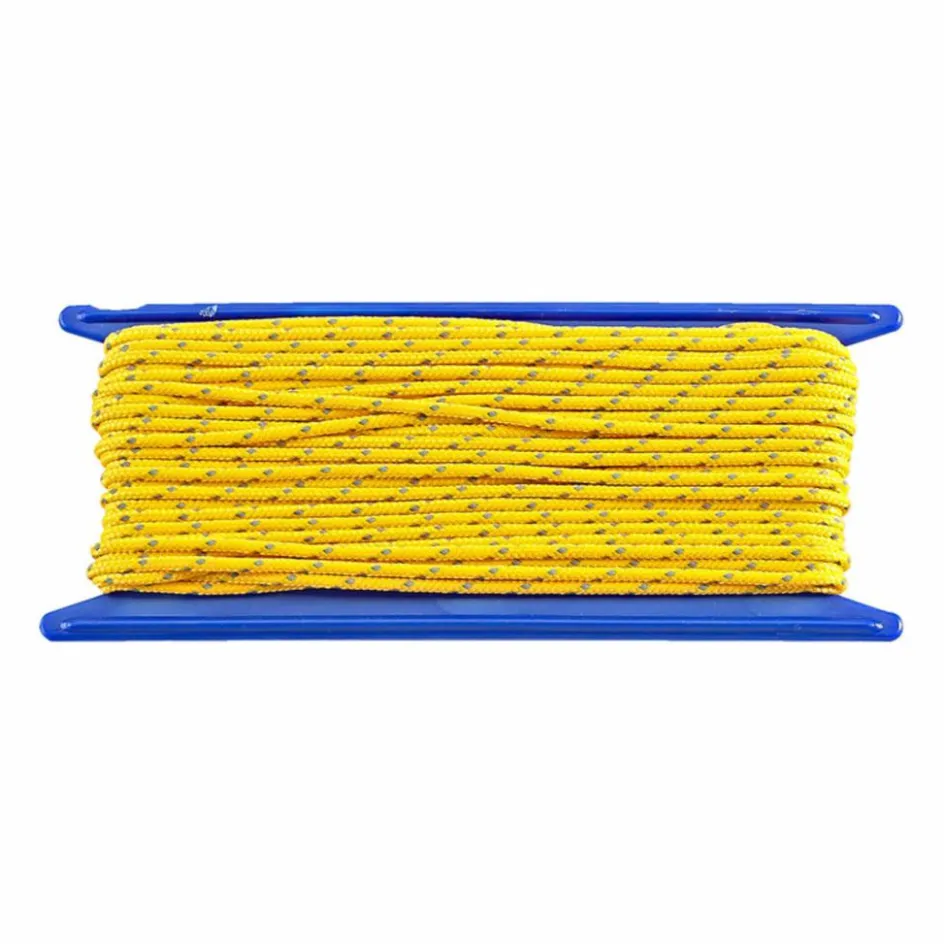 Reflektierende Abspannleine aus geflochtenem, hochfestem Polypropylen. Hilft, nach nächtlichem Paddelausflug das eigene Zelt wiederzufinden. Die Faser nimmt praktisch keine Feuchtigkeit auf.