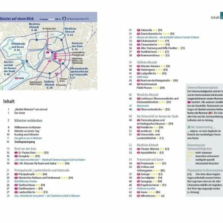Die wichtigsten Sehenswürdigkeiten und Museen der Stadt sowie weniger bekannte Attraktionen und Viertel ausführlich vorgestellt und bewertet – Faszinierende Architektur: mittelalterliche Sakralbauten, frühneuzeitliche Handelshäuser und postmoderne Glanzlichter – Abwechslungsreicher Stadtspaziergang – Erlebnisvorschläge für einen Kurztrip – Ausflüge ins Münsterland und auf den Spuren von Annette von Droste-Hülshoff – Shoppingtipps vom traditionellen Markt bis zu den schönsten Buchläden – Die besten Lokale der Stadt und allerlei Wissenswertes über die westfälische Küche – Tipps für die Abend- und Nachtgestaltung: vom Theaterbesuch bis zum angesagten Studentenklub