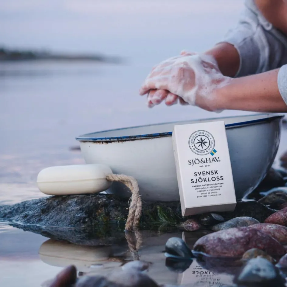 Die Sjökloss kann sowohl im Süßwasser als auch im Salzwasser angewendet werden und eignet sich auch gut als Rasierschaum. Sie wurde auf Basis von Kokosnuss und Raps hergestellt und enthält weder Konservierungsstoffe noch Palmöl. Das Hanfseil ermöglicht das Aufhängen der Seife zum Trocknen oder du hängst dir die Seife während des Duschens um dein Handgelenk, damit sie nicht auf den Boden gelegt werden muss.