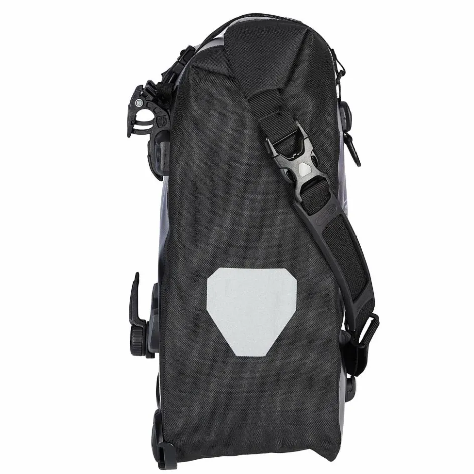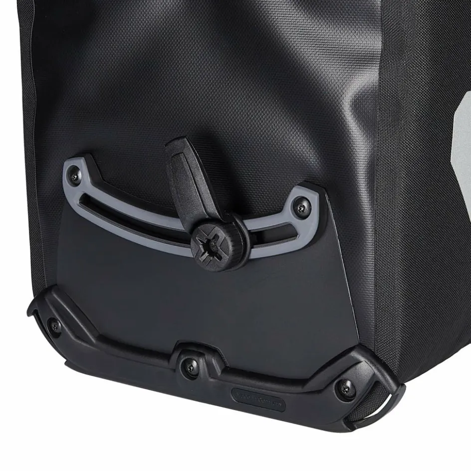 Aufhängung für Gepäckträger mit einem Rohrdurchmesser von 8 bis 16 mm. Beim QL2.1-System wurde die Schiene mit den Befestigungshaken an der Taschenrückseite überarbeitet. Die beiden oberen Haken lassen sich werkzeugfrei auf der nun aus einem Stück gefertigten Schiene verschieben und durch Anheben des Tragegriffs öffnen. Der untere Arretierungshaken ist ebenfalls auf einer halbelliptischen Schiene individuell anpassbar und werkzeugfrei in 15°-Schritten drehbar. Ein Scheuerschutz im unteren Bereich der Taschen und an der Auflagefläche des Gepäckträgers beugt Abrieb vor.