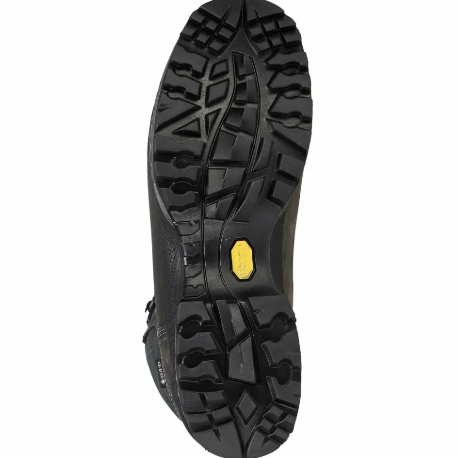 Eine Zwischensohle und ein Shock-Absorber im Fersenbereich dämpfen den Auftritt. Die feste Vibram-Laufsohle hat ein kräftiges Profil mit Brems- und Auftrittstollen. Diese mindern die Gefahr des Wegrutschens beim Auf- und Abstieg.