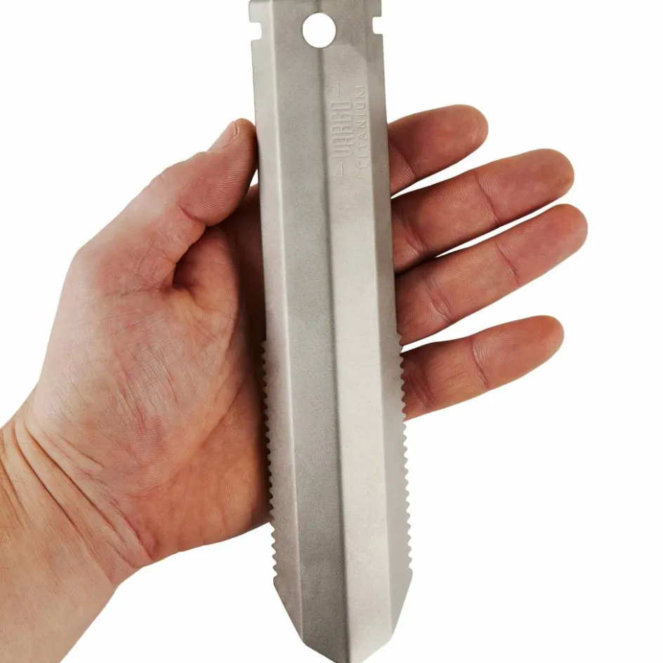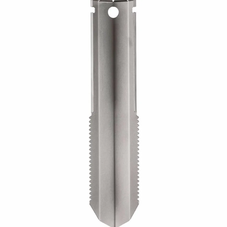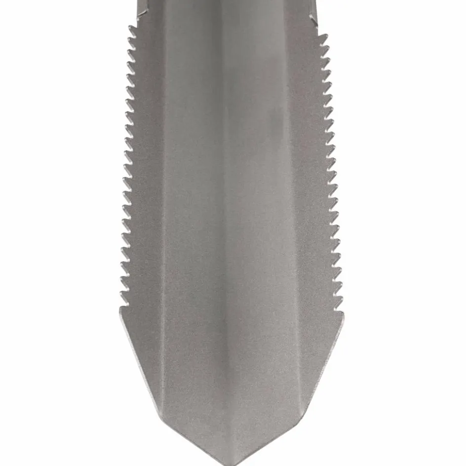 Multifunktionelles Tool für Bushcrafter, das als Notschaufel oder Hering genutzt werden kann. Die seitliche Sägezahnung bietet zusätzlichen Halt im Boden, kann aber auch Wurzeln mühelos zerschneiden.