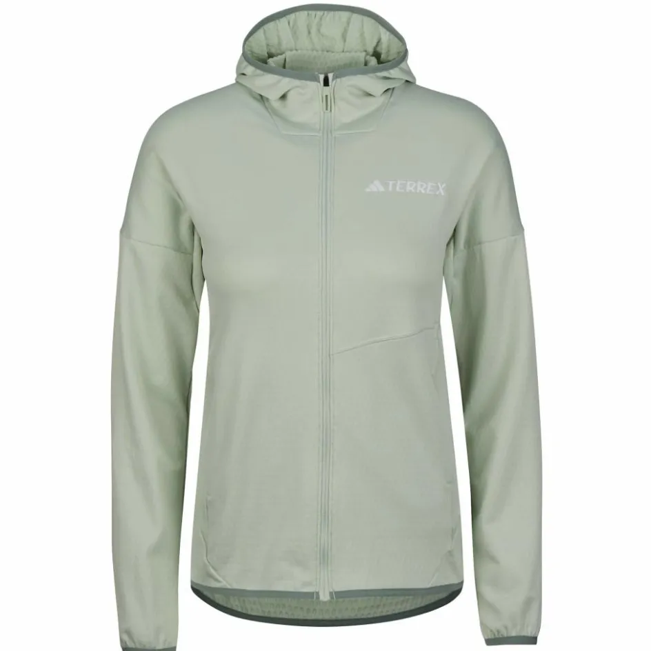 Diese Version der Terrex Xperior Light Fleece Hooded Jacket verfügt über versetzte Schulternähte und überschnittene Ärmel, die für einen bequemen Sitz sorgen, auch wenn du einen Rucksack schulterst. Der unterlegte Front-Reißverschluss bietet einen guten Schutz vor kaltem Wind.