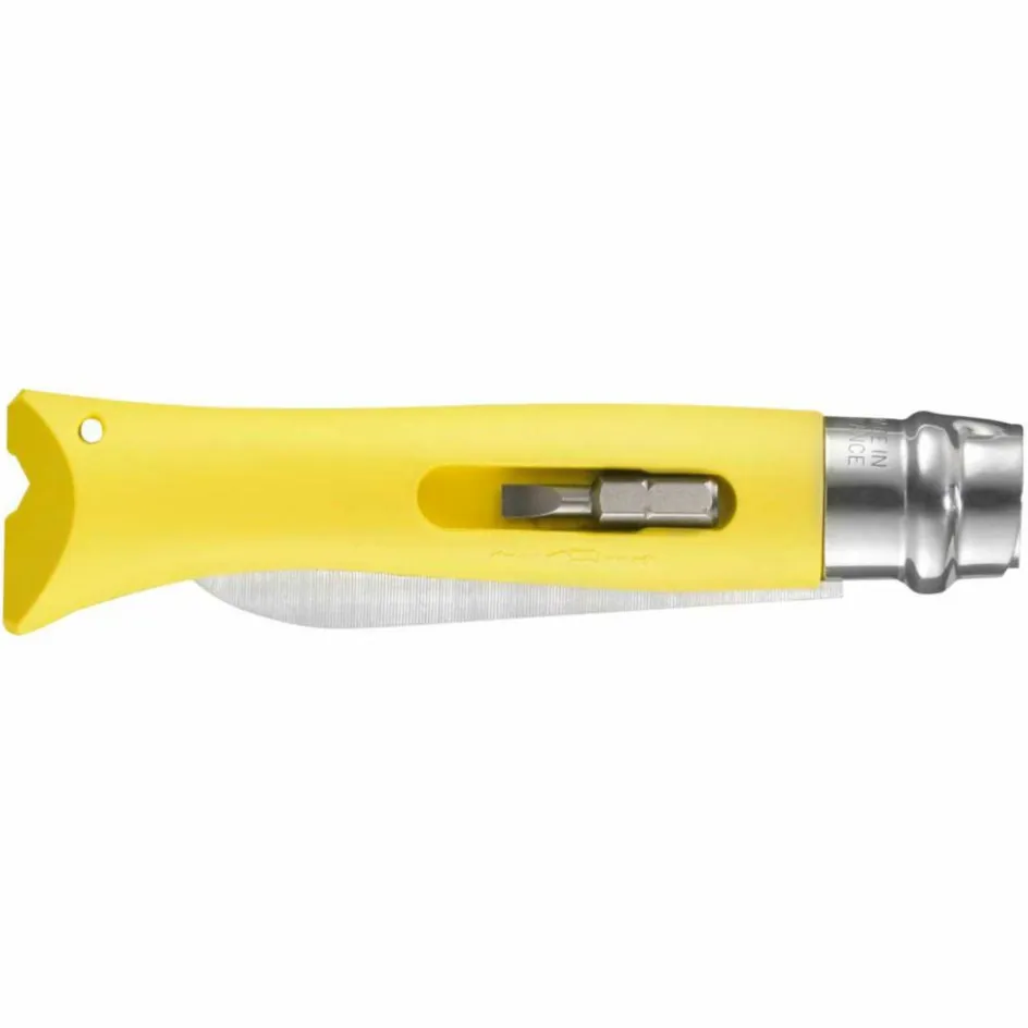 Die Version für den Handwerker oder Hobbybastler des beliebten französischen Alltagsmessers. Der neue glasfaserverstärkte Polyamid-Griff hat nun Platz für 2 6-Kant Bits an der Seite und einen magnetischen Bithalter im Fuß. Die etwas breitere Klinge verfügt im unteren Bereich über einen Abisolierer (bis 8mm Ø) und einen Drahtschneider (bis 5 mm Ø). Eine kleine Öse am Fuß lässt das Messer mit einer Handschlaufe oder einem Karabiner sichern. Geblieben ist der bewährte Opinel Sicherheitsring, der versehentliches Ein- oder Aufklappen der Klinge verhindert.