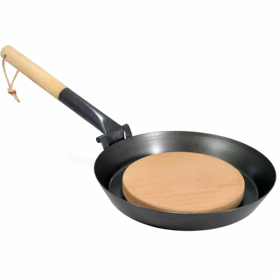 Pfanne aus Carbonstahl mit 24 cm Ø und vorbehandelter Oberfläche, sodass du sie ohne vorheriges Einbrennen sofort verwenden kannst. Der klappbare Eukalyptusholz-Griff sorgt für ein kleines Packmaß.