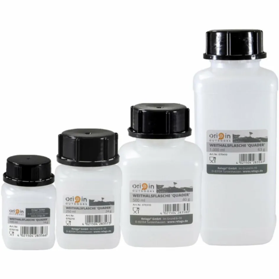Diese quaderförmigen, auslaufsicheren Weithalsflaschen eignen sich zum Transport von Lebensmitteln (Öl, Gewürze, Müsli usw.) oder zum sicheren Verstauen von kleinen Ausrüstungsteilen.