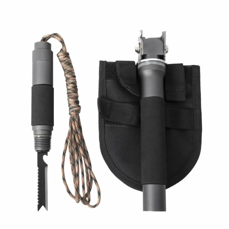 Die Survival-Schaufel besitzt einen Stil aus gehärtetem Aluminium, das kräftig und dennoch sehr leicht ist. Herzstück ist das Blatt aus gehärtetem Borstahl. Es dringt nicht nur gut in den Boden ein, sondern erfüllt durch das Kräftige Scharnier auch Hackarbeiten. Die Gesamtgröße des Spatens von 50 x 13 x 4 cm lässt eine Vielzahl an Arbeiten erledigen.