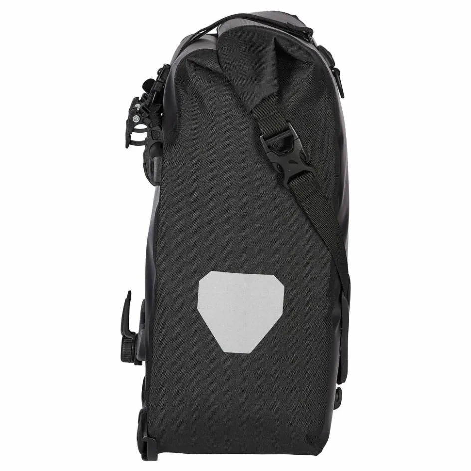 Aufhängung für Gepäckträger mit einem Rohrdurchmesser von 8 bis 16 mm. Beim QL2.1-System wurde die Schiene mit den Befestigungshaken an der Taschenrückseite überarbeitet. Die beiden oberen Haken lassen sich werkzeugfrei auf der nun aus einem Stück gefertigten Schiene verschieben und durch Anheben des Tragegriffs öffnen. Der untere Arretierungshaken ist ebenfalls auf einer halbelliptischen Schiene individuell anpassbar und werkzeugfrei in 15°-Schritten drehbar. Ein Scheuerschutz im unteren Bereich der Taschen und an der Auflagefläche des Gepäckträgers beugt Abrieb vor.