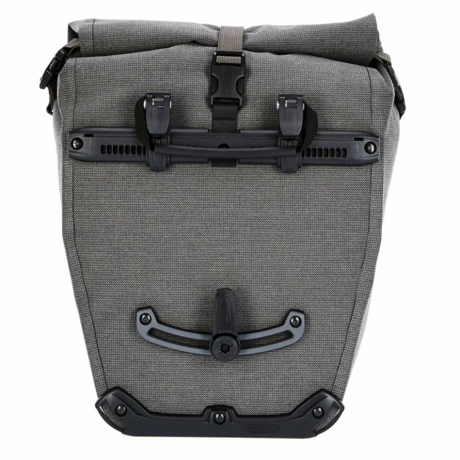 Aufhängung für Gepäckträger mit einem Rohrdurchmesser von 8 bis 16 mm. Beim QL2.1-System wurde die Schiene mit den Befestigungshaken an der Taschenrückseite überarbeitet. Die beiden oberen Haken lassen sich werkzeugfrei auf der nun aus einem Stück gefertigten Schiene verschieben und durch Anheben des Tragegriffs öffnen. Der untere Arretierungshaken ist ebenfalls auf einer halbelliptischen Schiene individuell anpassbar und werkzeugfrei in 15°-Schritten drehbar. Ein Scheuerschutz im unteren Bereich der Taschen und an der Auflagefläche des Gepäckträgers beugt Abrieb vor.