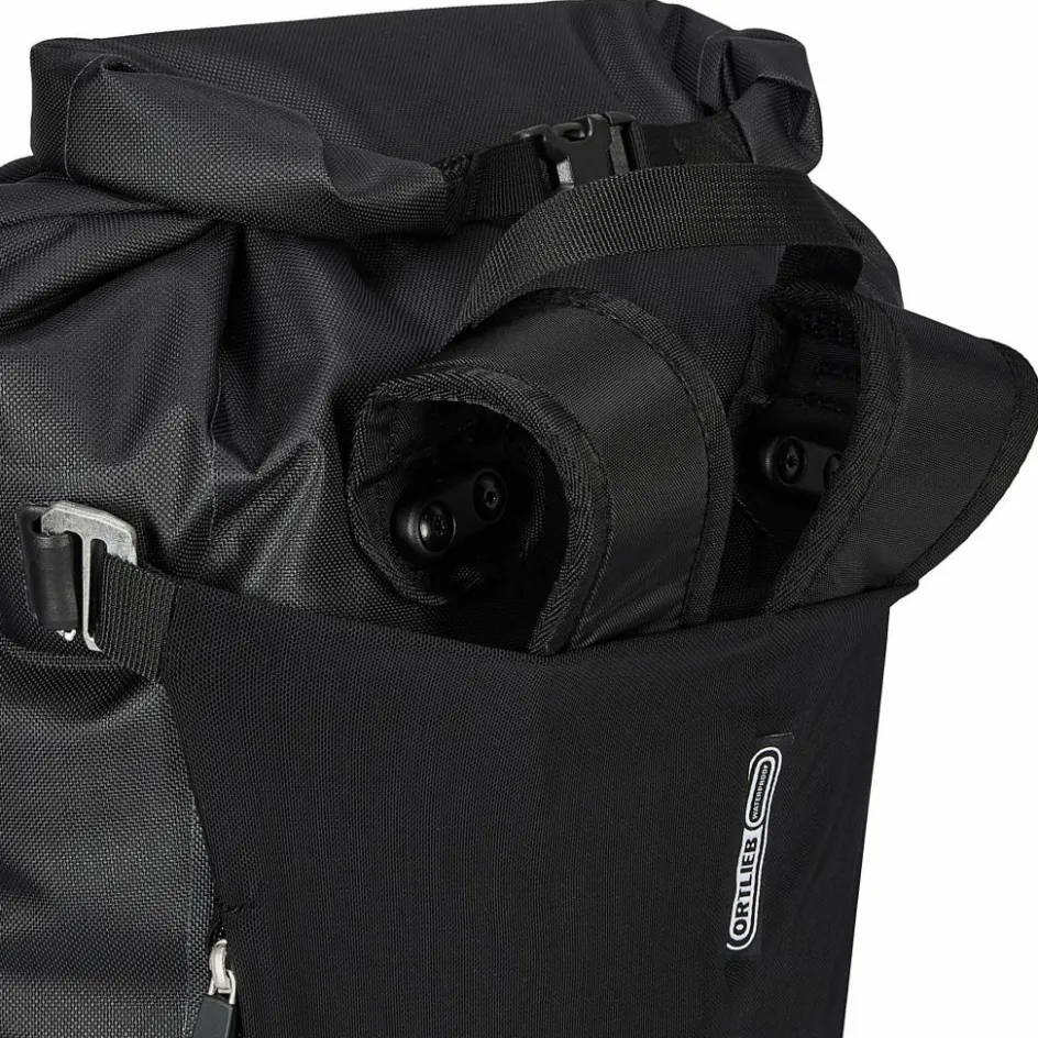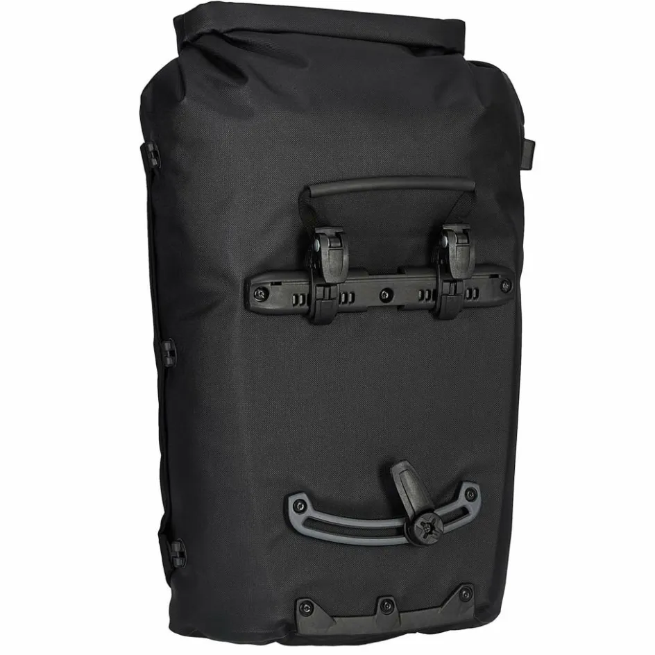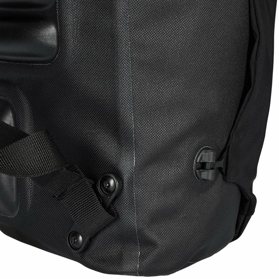 Aufhängung für Gepäckträger mit einem Rohrdurchmesser von 8 bis 16 mm. Die beiden oberen Haken lassen sich werkzeugfrei auf der aus einem Stück gefertigten Schiene verschieben und durch Anheben des Tragegriffs öffnen. Der untere Arretierungshaken ist ebenfalls auf einer halbelliptischen Schiene individuell anpassbar und werkzeugfrei in 15-Grad-Schritten drehbar. Ein Scheuerschutz im unteren Bereich der Taschen und an der Auflagefläche des Gepäckträgers beugt Abrieb vor.