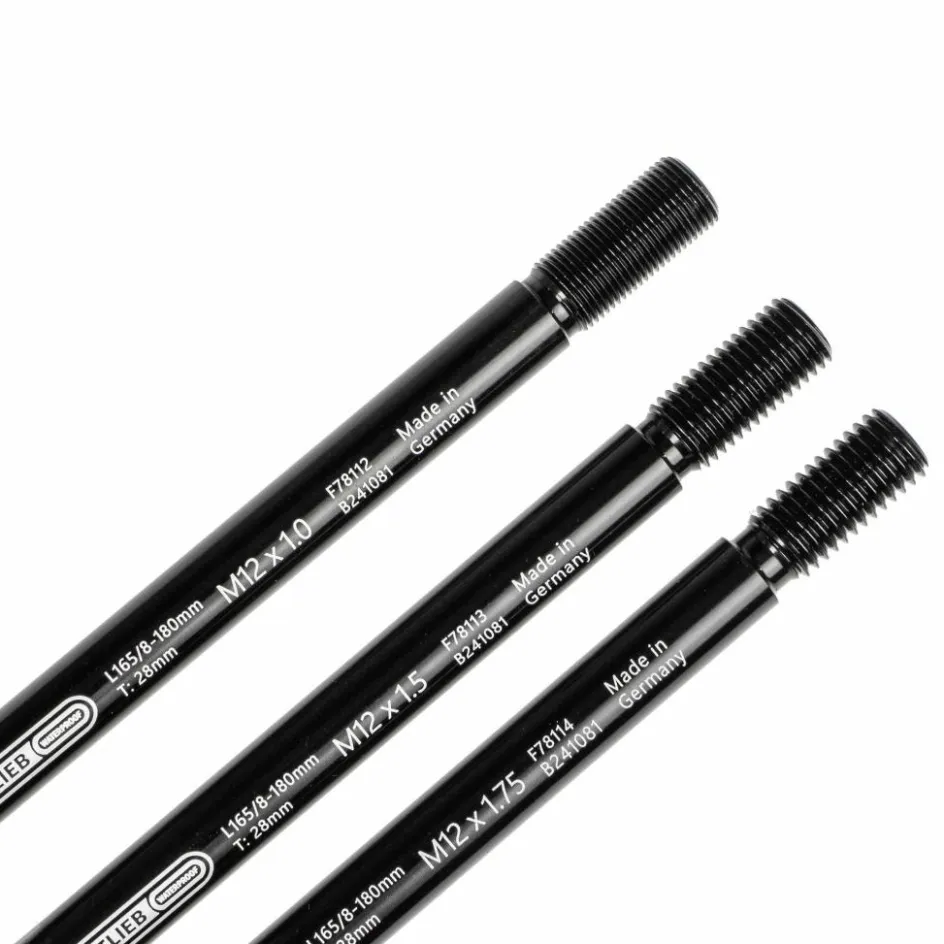 Die Thru Axle M6-Connector kommt hier in der 1,75 mm-Variante. Dieses Maß bezieht sich auf die Gewindesteigung des M12-Außengewindes am Ende der Thru Axle. Die Steckachse ist auch mit einer Gewindesteigung von 1 mm oder 1,5 mm erhältlich. Siehe dazu unter „Passend dazu“. Mit dieser universellen Steckachse lassen sich Achsen mit einer Achslänge bis zu 180 mm ersetzen.