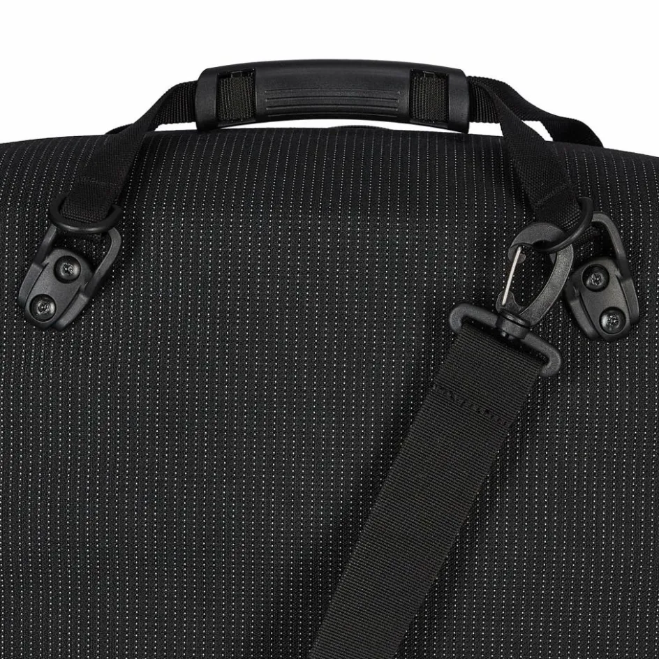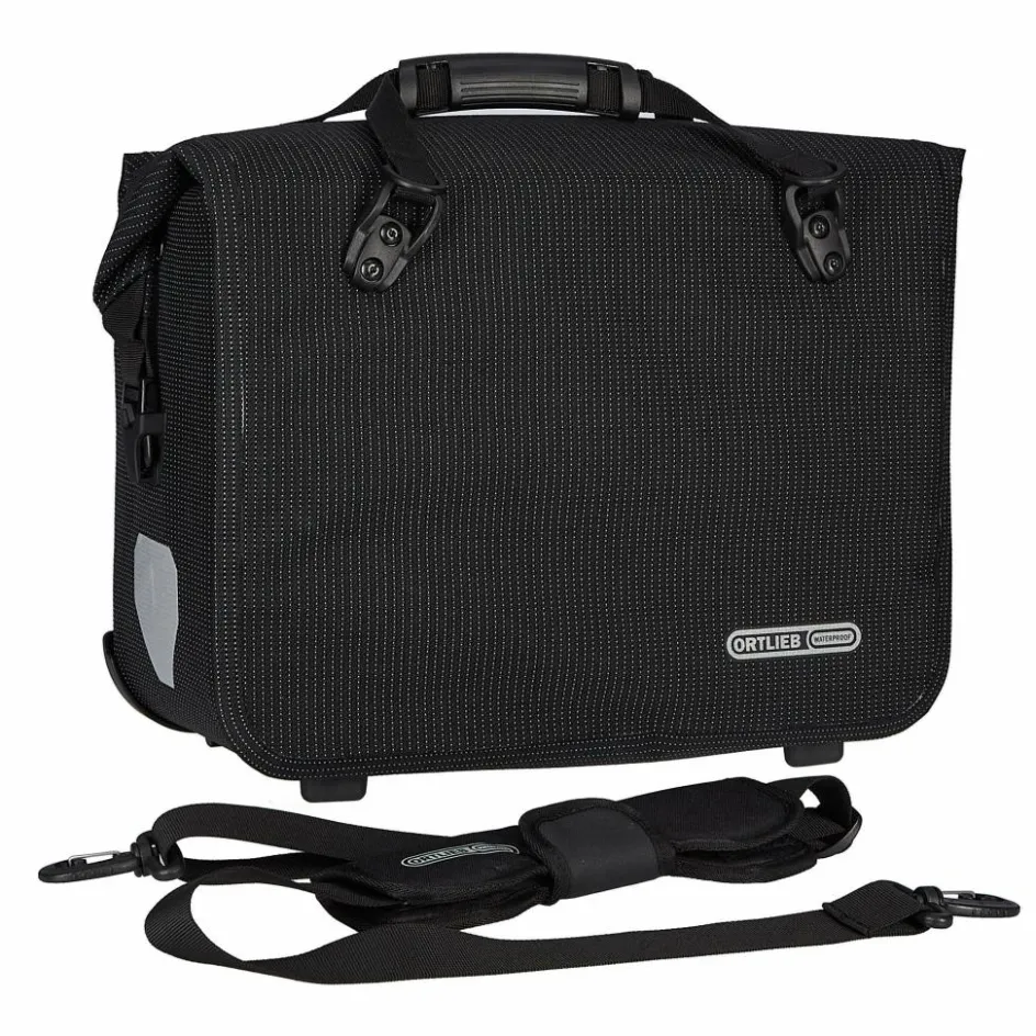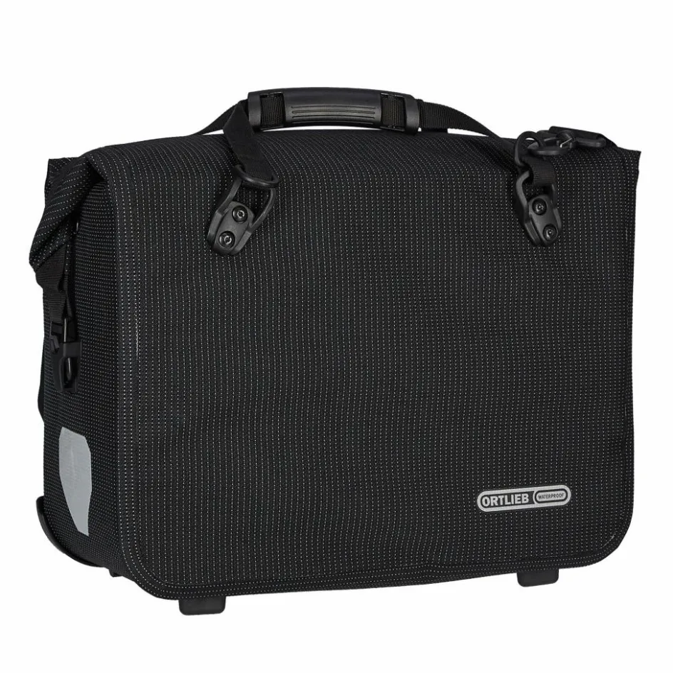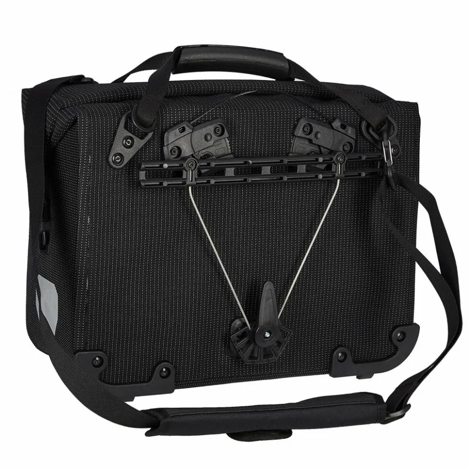 Tagsüber elegant-schwarz, nachts ein Leuchtfeuer für die Sicherheit: Die wasserdichte Fahrradaktentasche mit Reflexgarn wird nachts zum großen Reflektor. Außerdem jetzt mit neuem QL3.1-System!