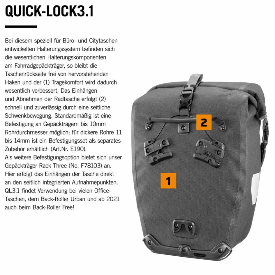 Der Clou bei QL3.1: Die wesentlichen Halterungskomponenten befinden sich am Gepäckträger und nicht an der Tasche. Bedeutet für die Tasche: Flacher Taschenrücken, nichts Hervorstehendes. In der Summe ergibt das ein hervorragendes Handling mit tollem Tragekomfort.