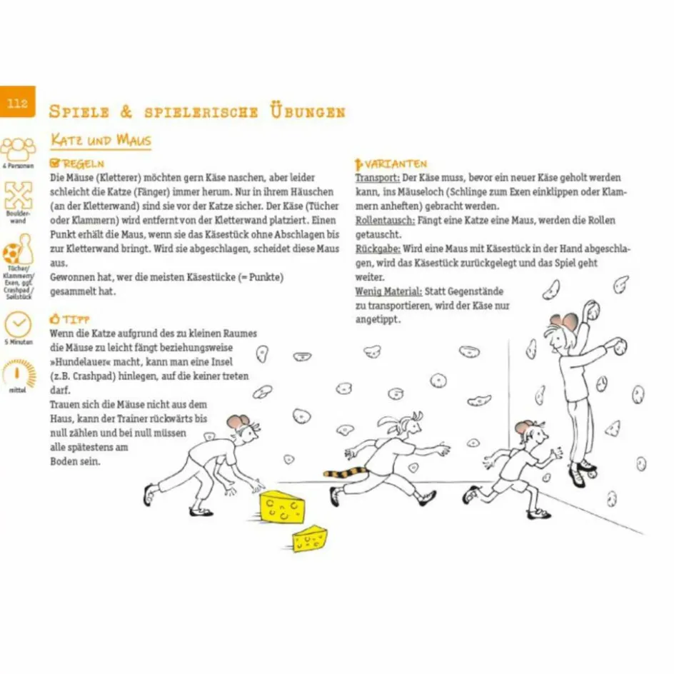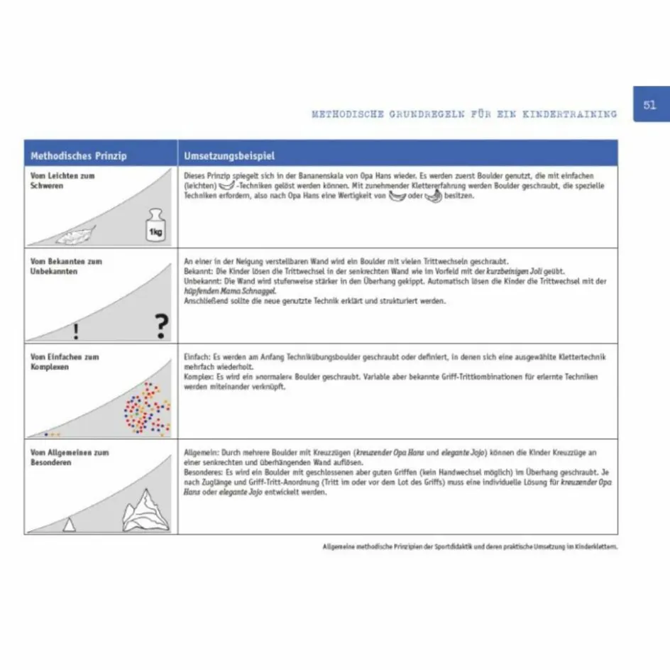 Übungen und Spiele sind thematisch geordnet und durch Inhaltsverzeichnis und Glossar trainingsspezifisch nachschlag- und anwendbar. Mit der Geschichte der Affenfamilie Schimpanski können Kinder- und Jugendtrainer ihre Schützlinge motivieren und die einzelnen Klettertechniken Comic-und Story-gestützt vermitteln.