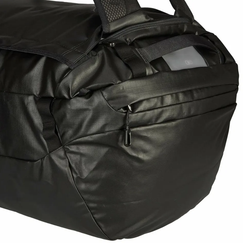 Die Duffel besitzt vier feste Handgriffe, die ein einfaches Verstauen und Festzurren im Flugzeug oder auf dem Autodach möglich machen. Obendrein ist sie mit bequemen Rucksackgurten ausgestattet. Diese sind aus einem weichen, perforierten Schaum und mit einem atmungsaktiven Netzstoff bezogen. Ein verstellbarer Brustgurt mit Signalpfeife hält die Träger an Ort und Stelle.