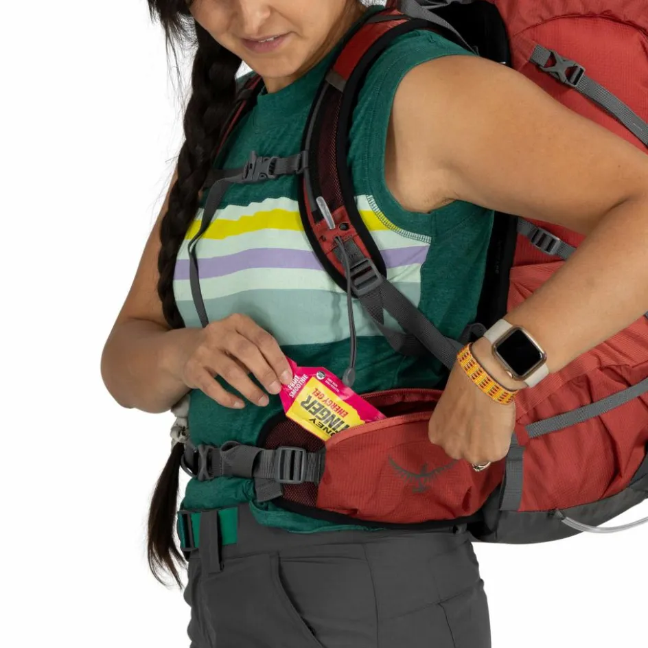 An den Fächern des Tempest hat sich nicht viel verändert – gut so! Denn der Tagesrucksack verfügt weiterhin über die durchdachte Raumaufteilung, die sich schon bei seinem Vorgänger auf zahllosen Wanderkilometern bewährt hat. Für Kleinigkeiten wie das Handy oder ein Erste-Hilfe-Set gibt es im Deckel außen und innen je ein RV-Fach. Das elastische Netzfach auf der Front eignet sich ideal, um deine nasse Regenjacke aufzubewahren, während die seitlichen Steckfächer Platz für zwei Trinkflaschen bieten. Mithilfe der RV-Fächer auf den Hüftflossen sind Müsliriegel, Taschentücher und Co. immer schnell zur Hand. Besonders praktisch ist auch Ospreys Stow-on-the-Go Trekkingstockhalterung, mit der du deine Stöcke auch mit geschultertem Rucksack bequem erreichst.