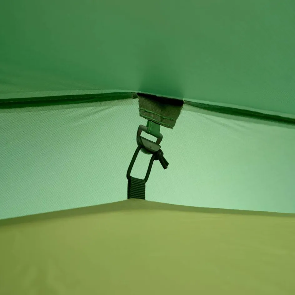 Die Besonderheit dieses Modells ist das großzügige Raumangebot im Innenzelt. Im Kopfbereich stehen dir 135 cm Breite zur Verfügung. Der zweite Ausgang ist ohne Apsis gestaltet und in den Innenraum integriert. So entsteht ein trockener Bereich im Zelt, der sich hervorragend zum Ablegen von Ausrüstung und Bekleidung eignet.