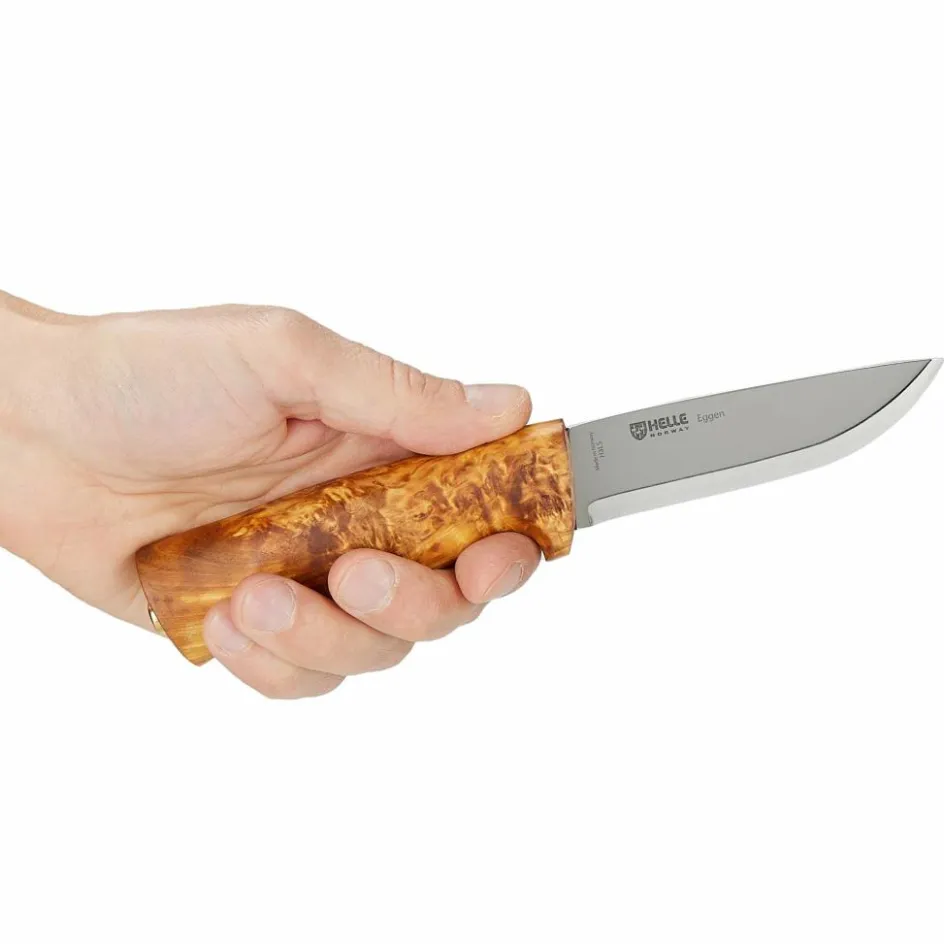 Eines der erfolgreichsten Modelle von Helle ist das 1998 von Gunnar Lothe entworfene Eggen. Kein Wunder, denn wer es einmal in der Hand gehalten hat, möchte so schnell kein anderes Messer mehr verwenden. Der Griff besteht aus einem Stück ausgewähltem Birkenholz, das poliert und geölt wurde, um die einzigartige Maserung des Holzes perfekt zur Geltung zu bringen. Zur Klinge hin ist der 11 cm lange Griff zur Parierstange ausgeformt, was auch größeren Händen einen sicheren Halt bietet.