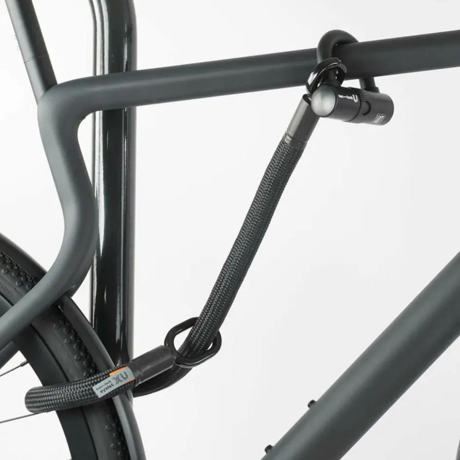 Das Eyelet selbst ist dank der beiden unterschiedlich großen Ösen äußerst vielsseitig zu fixieren, da es sich durchfädeln lässt: So kannst du das Schloss um feste Gegenstände und dein Rad schlingen, durchfädeln (eine Öse durch die andere) und anschließend mit dem U- oder dem X-Lock Bügelschloss sichern. Je nachdem, welchen Bügel du gerade verwenden möchtest.