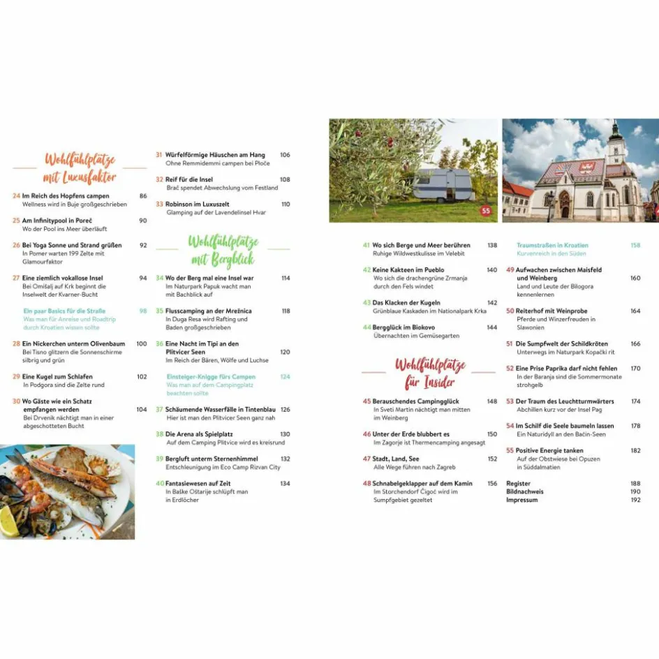 Ob im kompakten Zelt oder im großen Wohnmobil: erholsames Camping ist auf den richtigen Stellplätzen in Kroatien für jeden Urlauber möglich! Wer nach Kroatien zum Campen fährt, hat eher die Qual der Wahl als zu wenig Auswahl. Doch oft sind die Campingplätze riesig, laut und voll. Erholung ist da manchmal Fehlanzeige. Mit der kleinen, feinen Auswahl dieses Happy-Camping-Führers finden Erholungsuchende das, was sie möchten: kaum bekannte Plätze in Binnenkroatien, kleinere Camps an der Adria und auf den Inseln – und natürlich auch ein paar liebevoll ausgewählte FKK-Campingplätze.