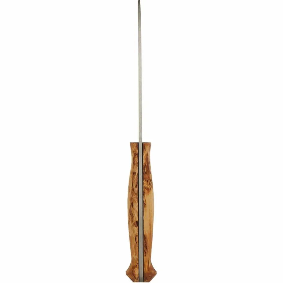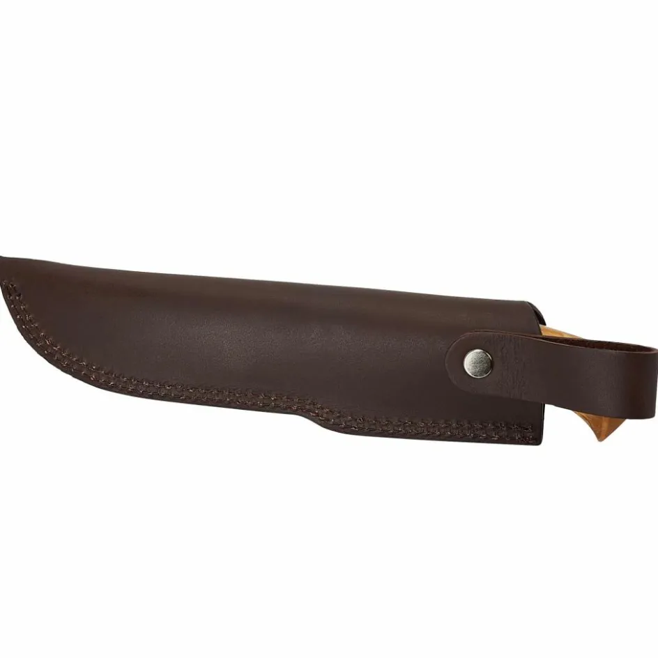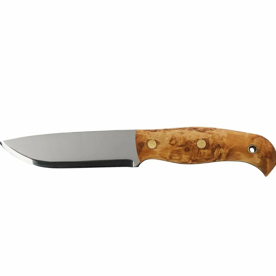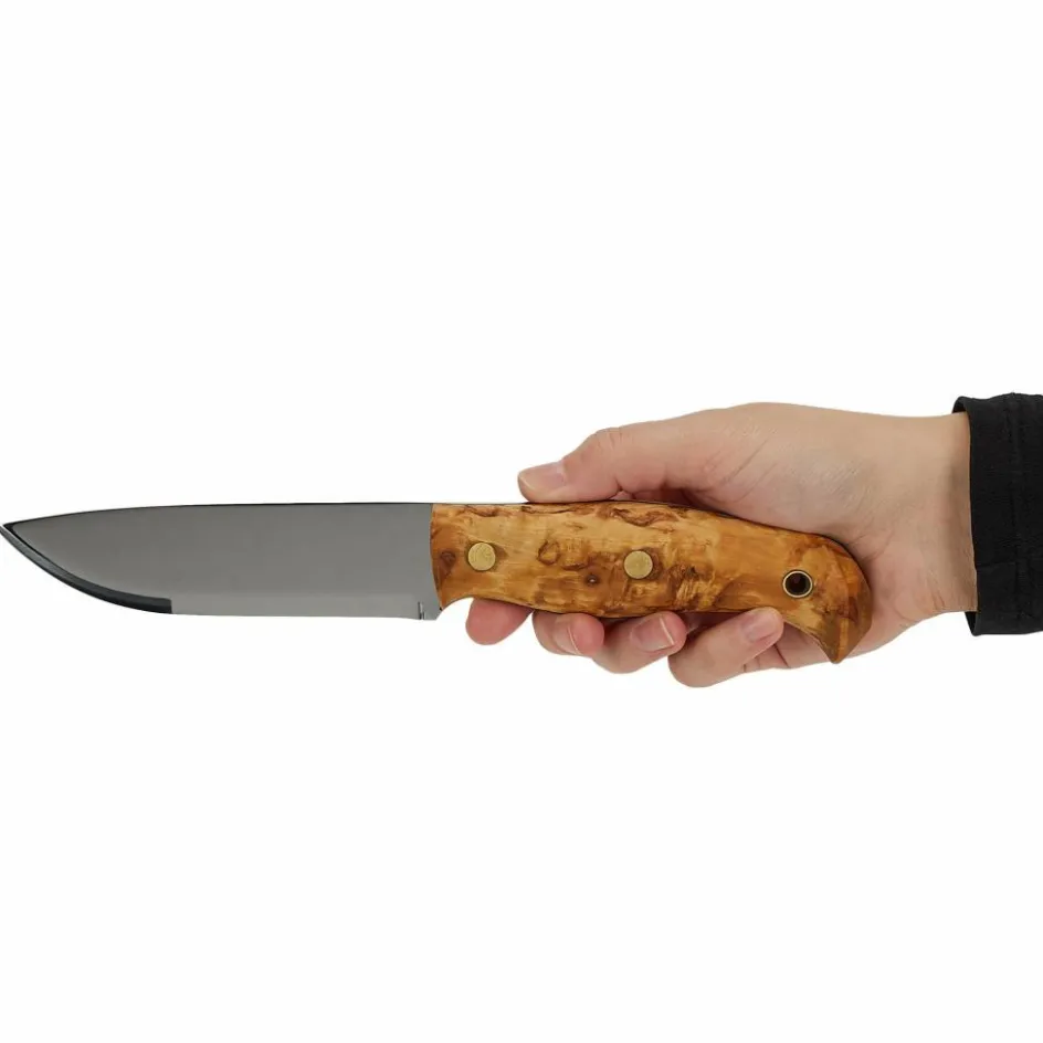 Der 12,4 cm lange Griff aus Maserbirkenholz ist poliert und geölt, wodurch die Maserung besonders schön zur Geltung kommt. Der geschwungene Knauf am Griffende verbessert das Handling beim Hacken. Ob Batoning, Schnitzen, Funken für das Lagerfeuer mit einem Feuerstahl schlagen oder Lebensmittel schneiden – das Nordlys stellt sich so gut wie jeder Aufgabe ohne Probleme.