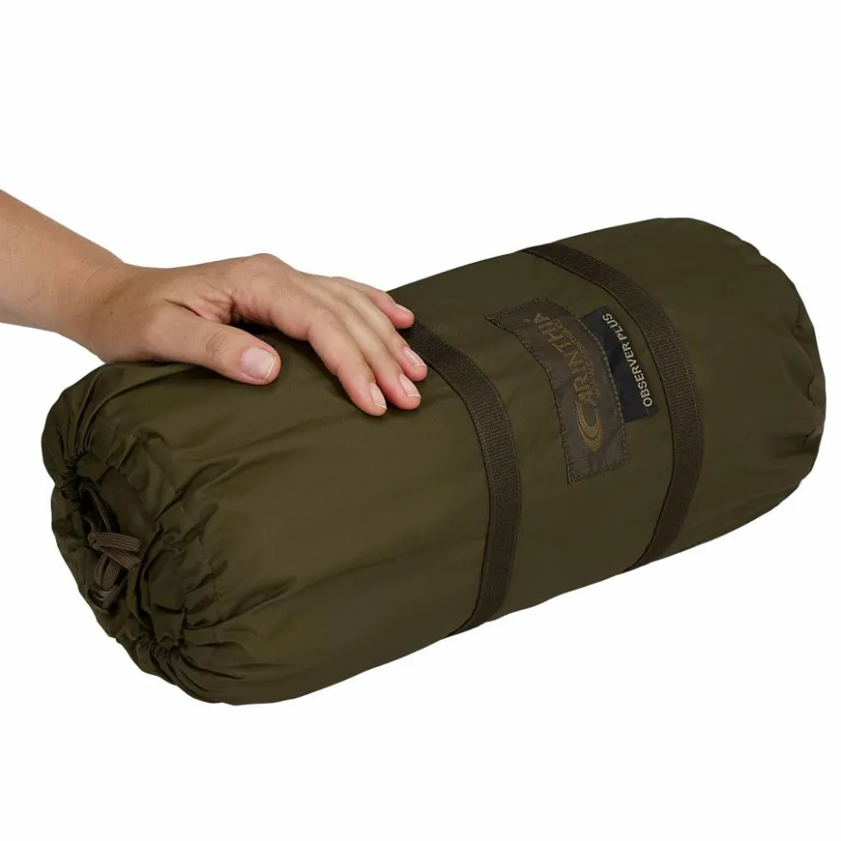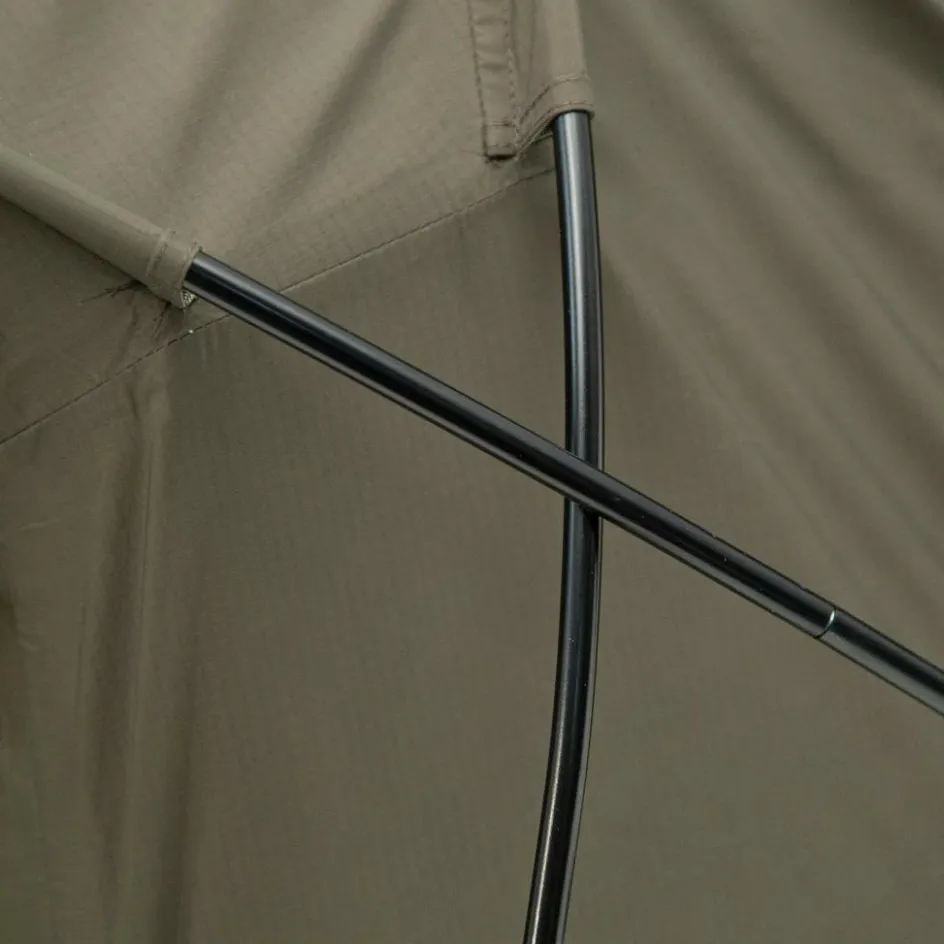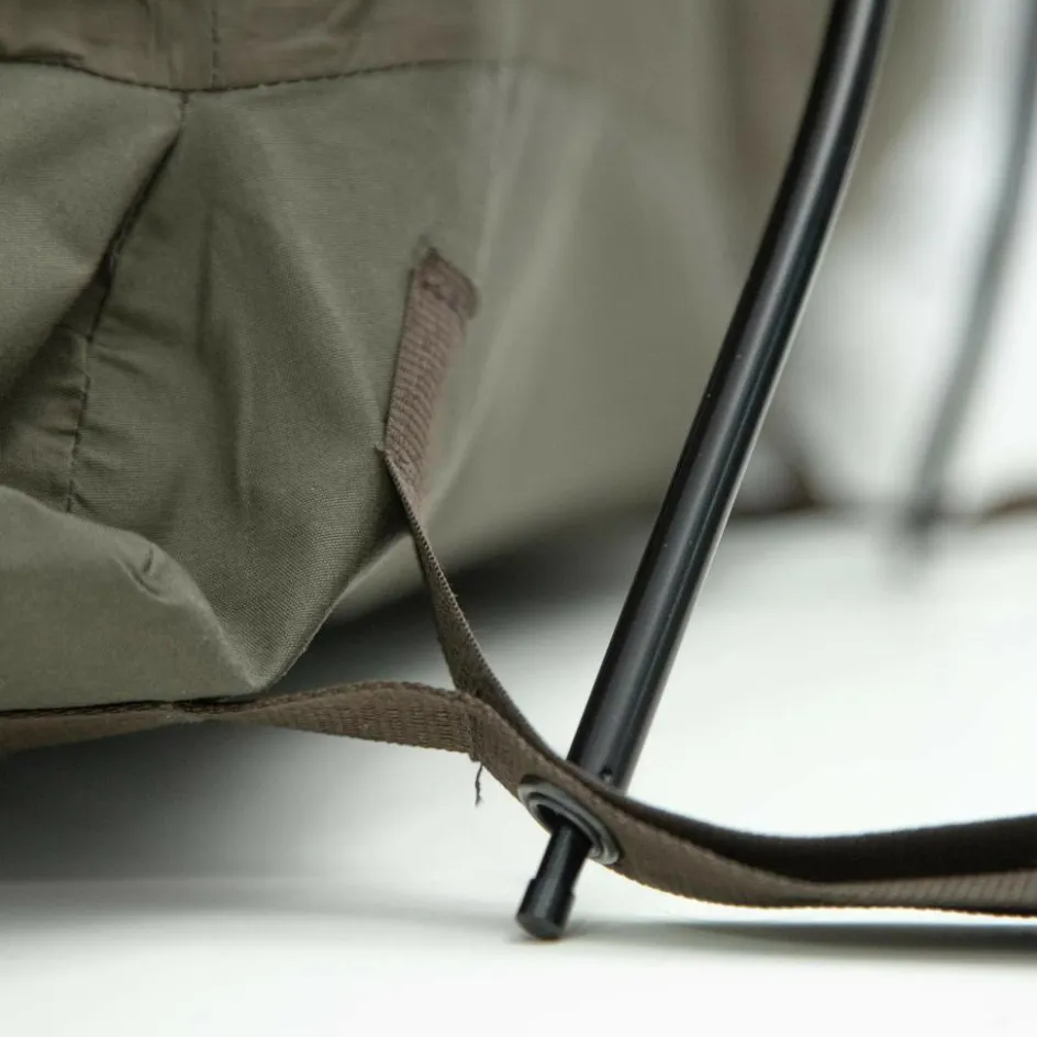 Das Observer Plus lässt sich freistehend aufbauen und bildet dank der beiden kreisförmig geformten Gestängebögen eine stabile Kuppelstruktur am Kopfende. Der Zugang erfolgt über eine praktische L-förmige Seitenöffnung mit zwei Reißverschlüssen.
