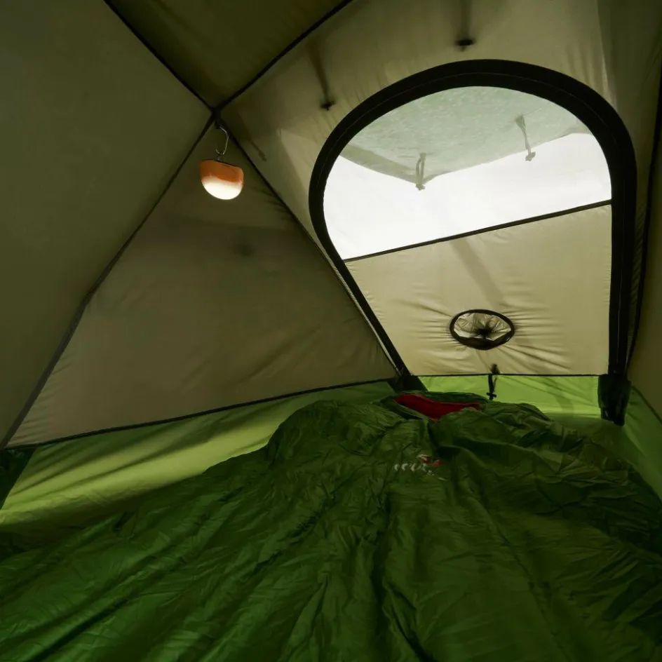 In der Apsis kannst du dein Gepäck und die Schuhe recht bequem unterbringen. Die Tür lässt sich weit öffnen und aufrollen. Das erleichtert dir das Ein- und Auspacken deiner Ausrüstung ins Innenzelt. In diesem geht es geräumig weiter. Mit 70 bis 97 cm Breite hast nicht nur du, sondern bei Bedarf auch dein Trekkingrucksack Platz. Der große Lüfter im Innenzelt sorgt für gute Belüftung in der Nacht.