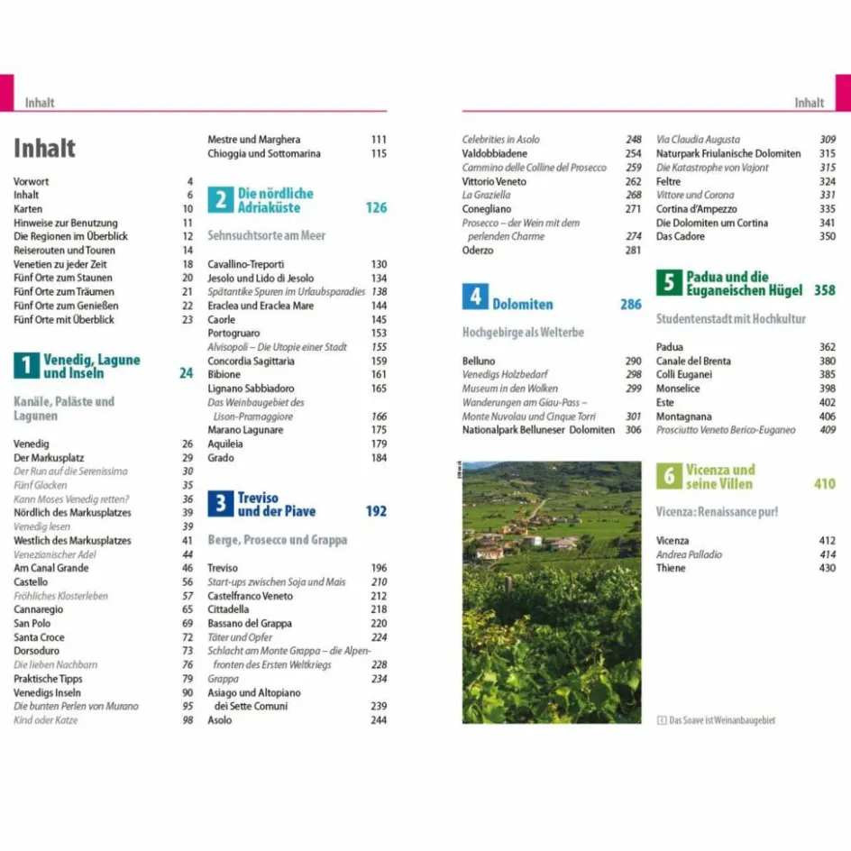 - Übersichtsseiten mit Beschreibungen aller Regionen: Von Venedig und seiner Lagune über die nördliche Adriaküste, Treviso und den Piave, die Dolomiten, Padua und die Euganeischen Hügel, Vicenca und seine Villen, Verona und den Gardasee bis nach Rovigo und zum Po-Delta