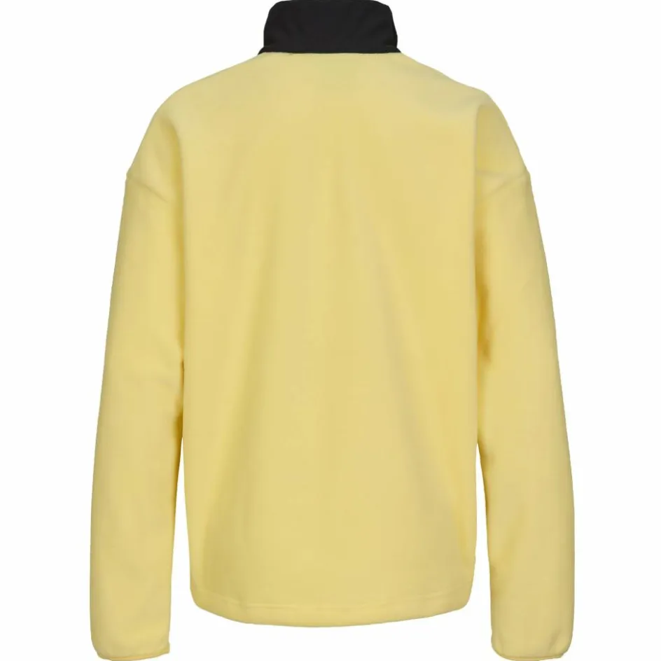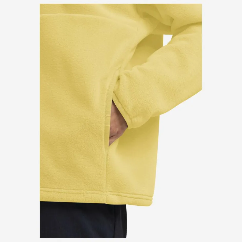 Der Fleecepullover besteht zu 100 % aus recycelten Polyesterfasern. Das weiche Material liegt sehr angenehm auf der Haut und speichert die Körperwärme effektiv. Außerdem trocknet das Fleece-Material rasant, wenn du beim Aufbau des Vorzeltes ins Schwitzen geraten bist. In diesem Fall kannst du auch den halblangen Front-Reißverschluss zur schnellen Abkühlung öffnen. Die lockere Passform und die überschnittenen Ärmel sorgen für volle Bewegungsfreiheit und einen sehr bequemen Sitz.