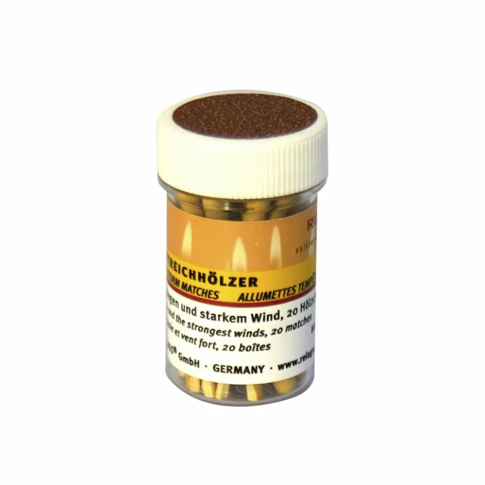 20 Streichhölzer sind in dieser kleinen Plastikdose untergebracht. Der Deckel mit Schraubverschluss und Reibfläche dichtet die Dose wasserdicht ab und dient als Zündfläche.