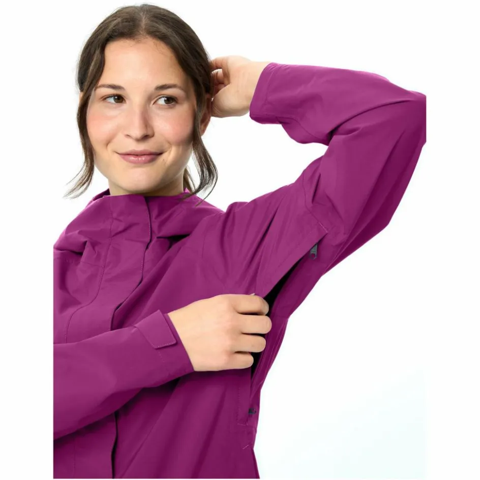 Wertgegenstände wie Smartphone, Geld oder Taschentücher finden in den vorderen Reißverschlusstaschen Platz. Für zusätzliche Flexibilität sorgt der Zwei-Wege-Reißverschluss, der es ermöglicht, die Jacke sowohl von oben als auch von unten zu öffnen – praktisch für den schnellen Zugriff auf Hosentaschen oder zur zusätzlichen Belüftung. Die Kapuze lässt sich mit einer Hand individuell anpassen. Zusätzlich zur wasserdichten Membran ist der Oberstoff der Regenjacke mit Eco Finish wasser- und schmutzabweisend ausgerüstet.