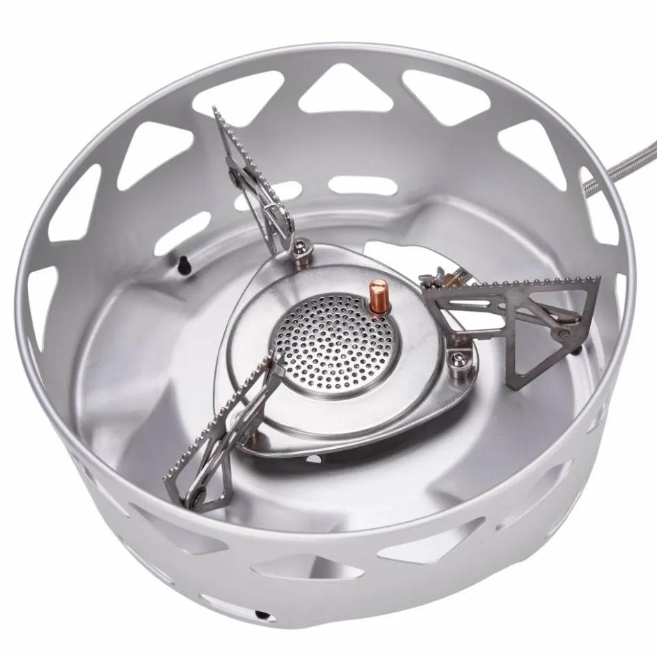 Der Kocher ist im Windschutz integriert und ist somit schnell einsatzbereit. Einfach aufstellen, Gaskartusche anschrauben und los geht das Vergnügen. Auf dem Windschutz stehen die Töpfe sicher und kippstabil.