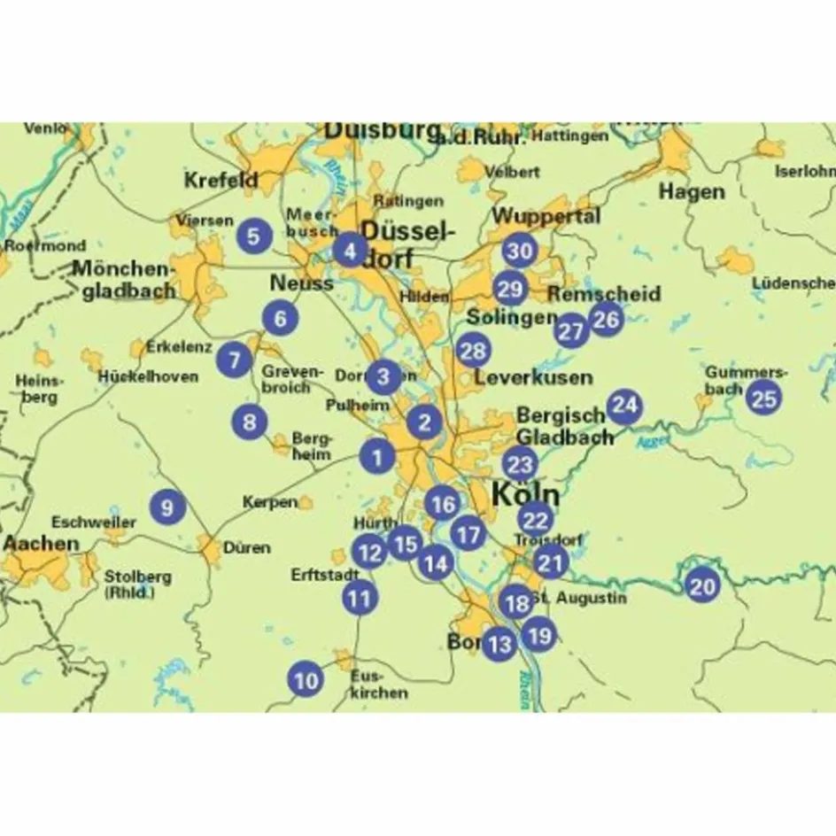 Obwohl es eine der am dichtestebn besiedelten Regionen Deutschlands ist, können Sie sich auf unvergleichliche Radel-Erlebnisse freuen. Rund um die rheinische Metropole Köln rollen Sie auf Flussradwegen entlang von Rhein, Sieg, Agger und Erft, entdecken autorfreie Bahntrassen im Bergischen Land, erfrischen sich an Talsperren und kurbeln mit High Speed entlang einer ehemaligen Kohlenbahn.